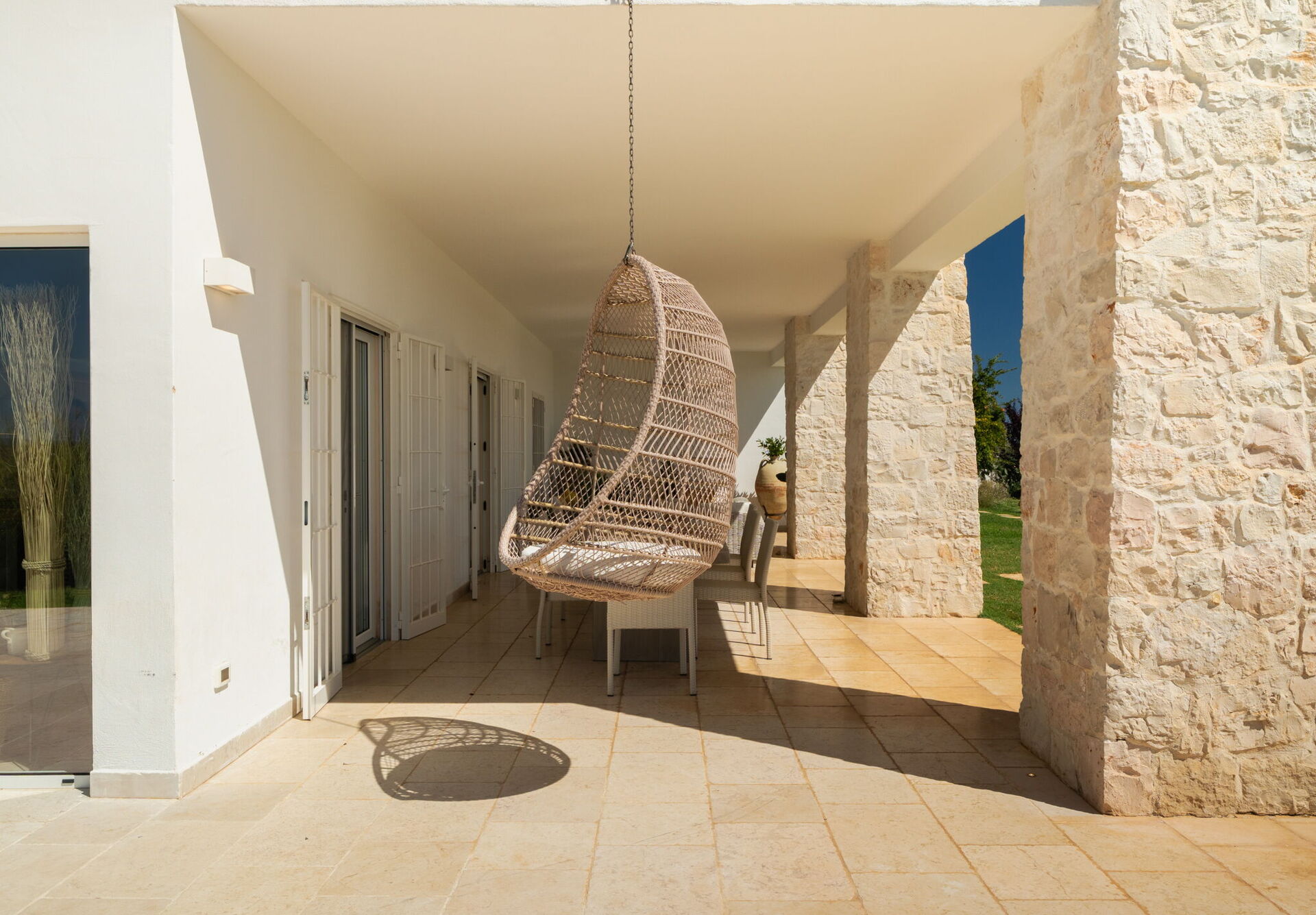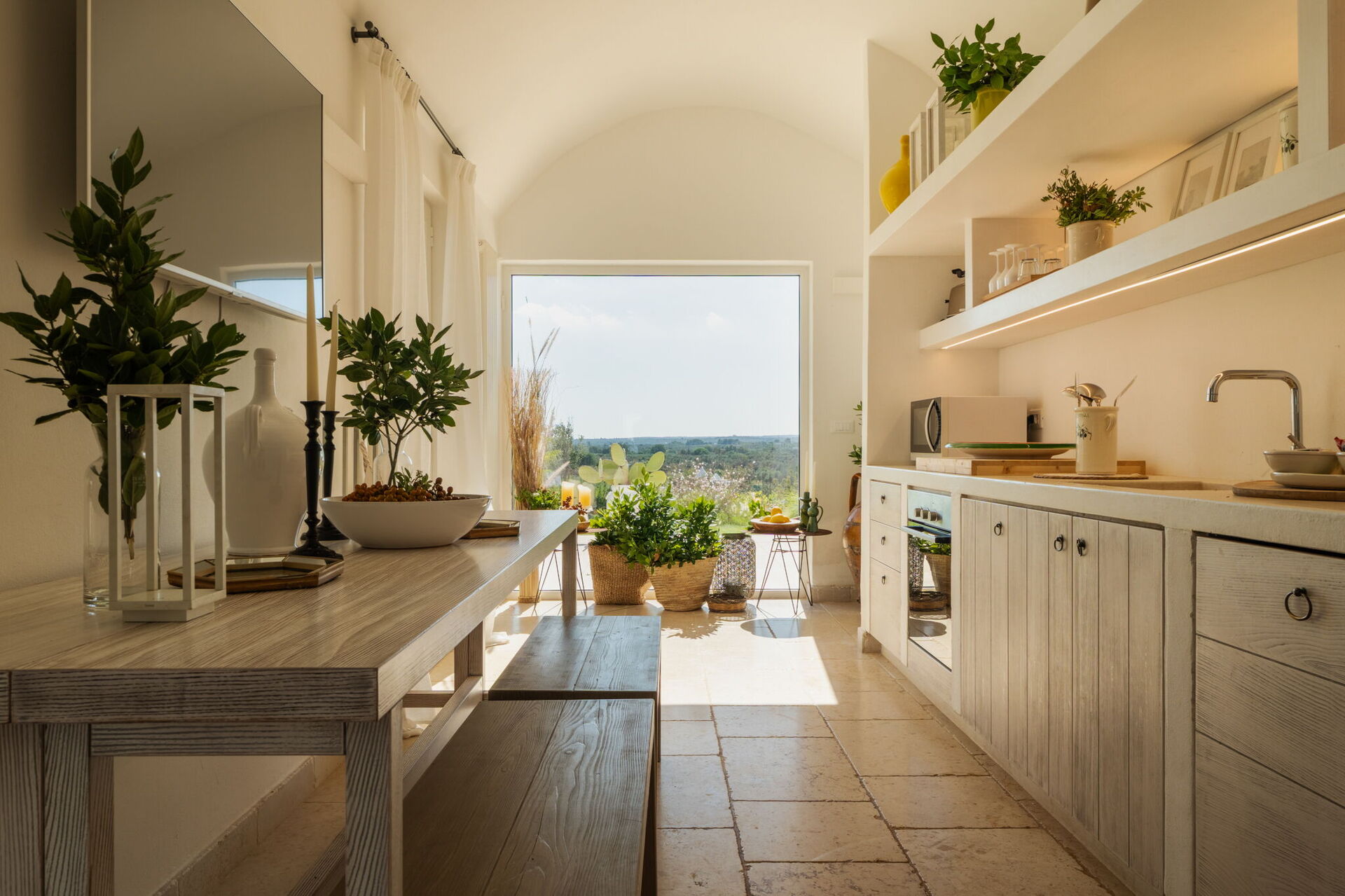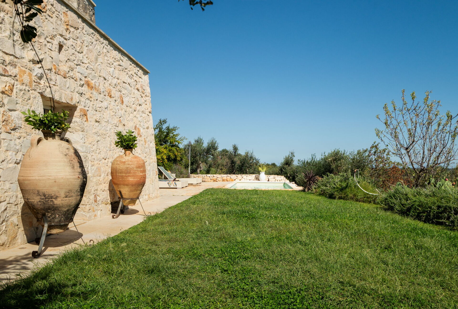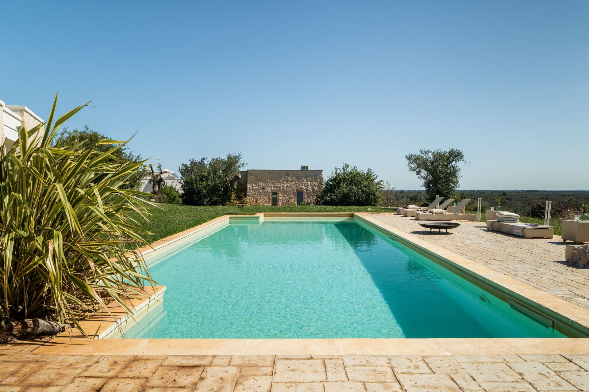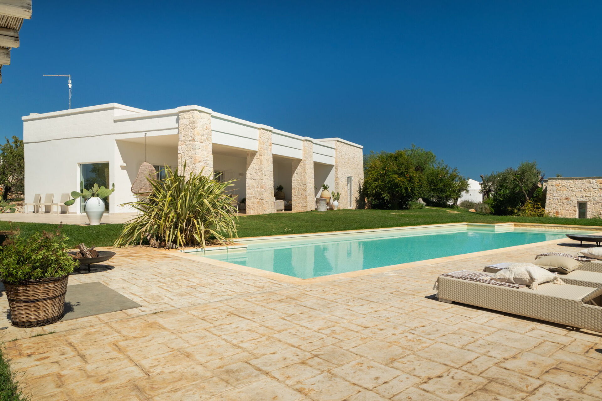 Fresh, full of light, this property stands in the countryside, twenty abundant minutes from the coast, this small estate offers privacy and a full immersion in the Apulia countryside, yet it’s close to all the most relevant destinations in the area, just seven kilometres from Ostuni. The home design, approached with research in the historical context, results in a newclassic style with modern tiled floors and tuff stone walls together with vaulted ceilings that lend a rustic and airy feel to the interiors. Elements of classic local residential architecture, such as the exposed stones, are combined with contemporary touches, like bottom to ceiling windows and modern infrastructure and energysaving systems.