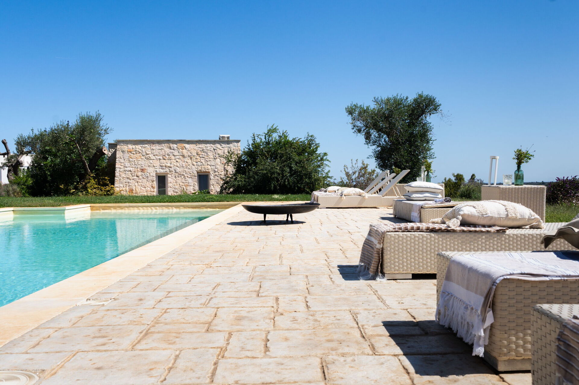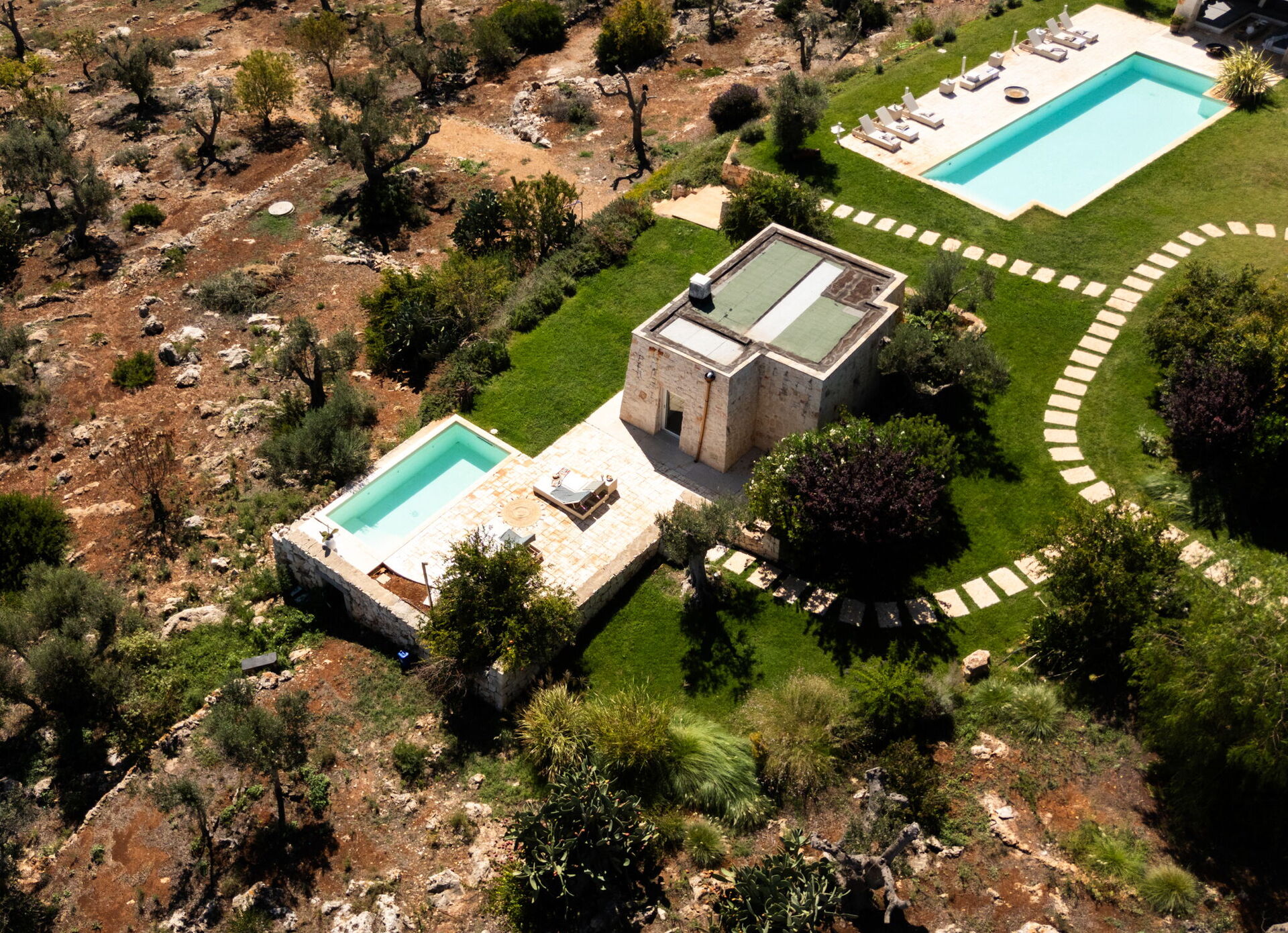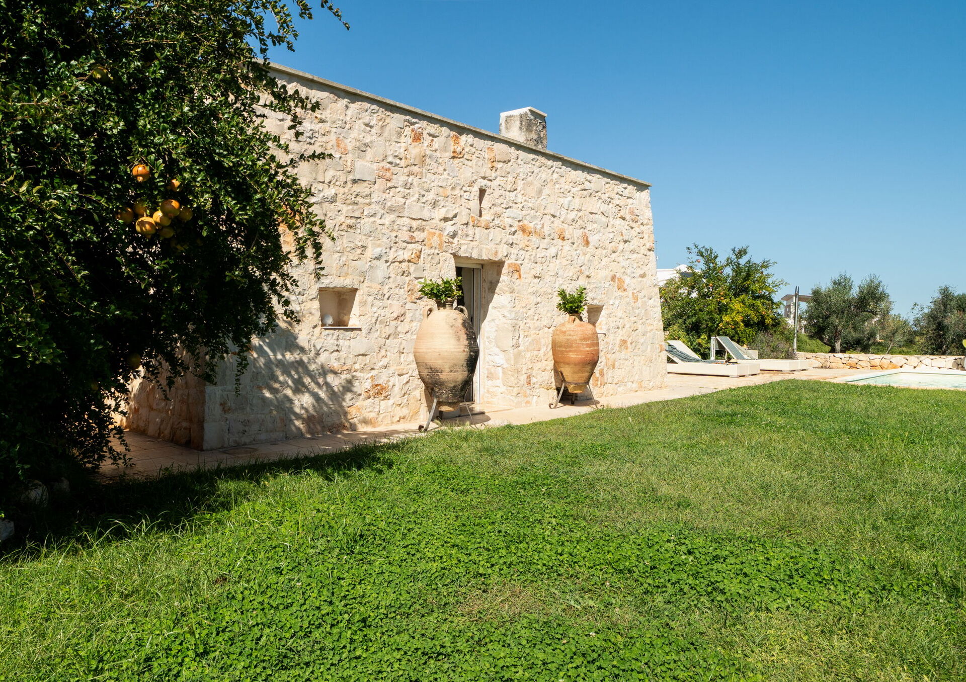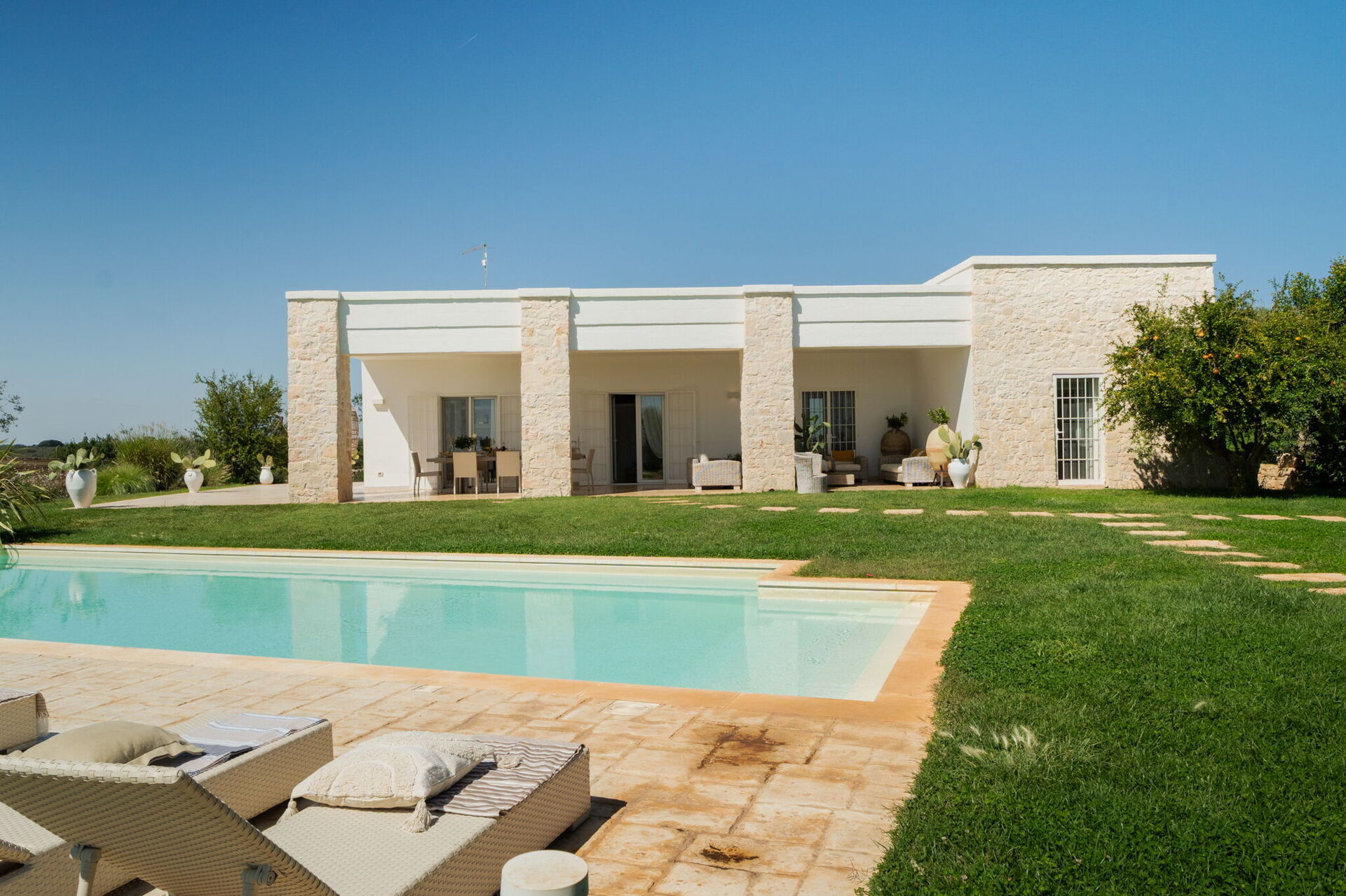 Fresh, full of light, this property stands in the countryside, twenty abundant minutes from the coast, this small estate offers privacy and a full immersion in the Apulia countryside, yet it’s close to all the most relevant destinations in the area, just seven kilometres from Ostuni. The home design, approached with research in the historical context, results in a newclassic style with modern tiled floors and tuff stone walls together with vaulted ceilings that lend a rustic and airy feel to the interiors. Elements of classic local residential architecture, such as the exposed stones, are combined with contemporary touches, like bottom to ceiling windows and modern infrastructure and energysaving systems.