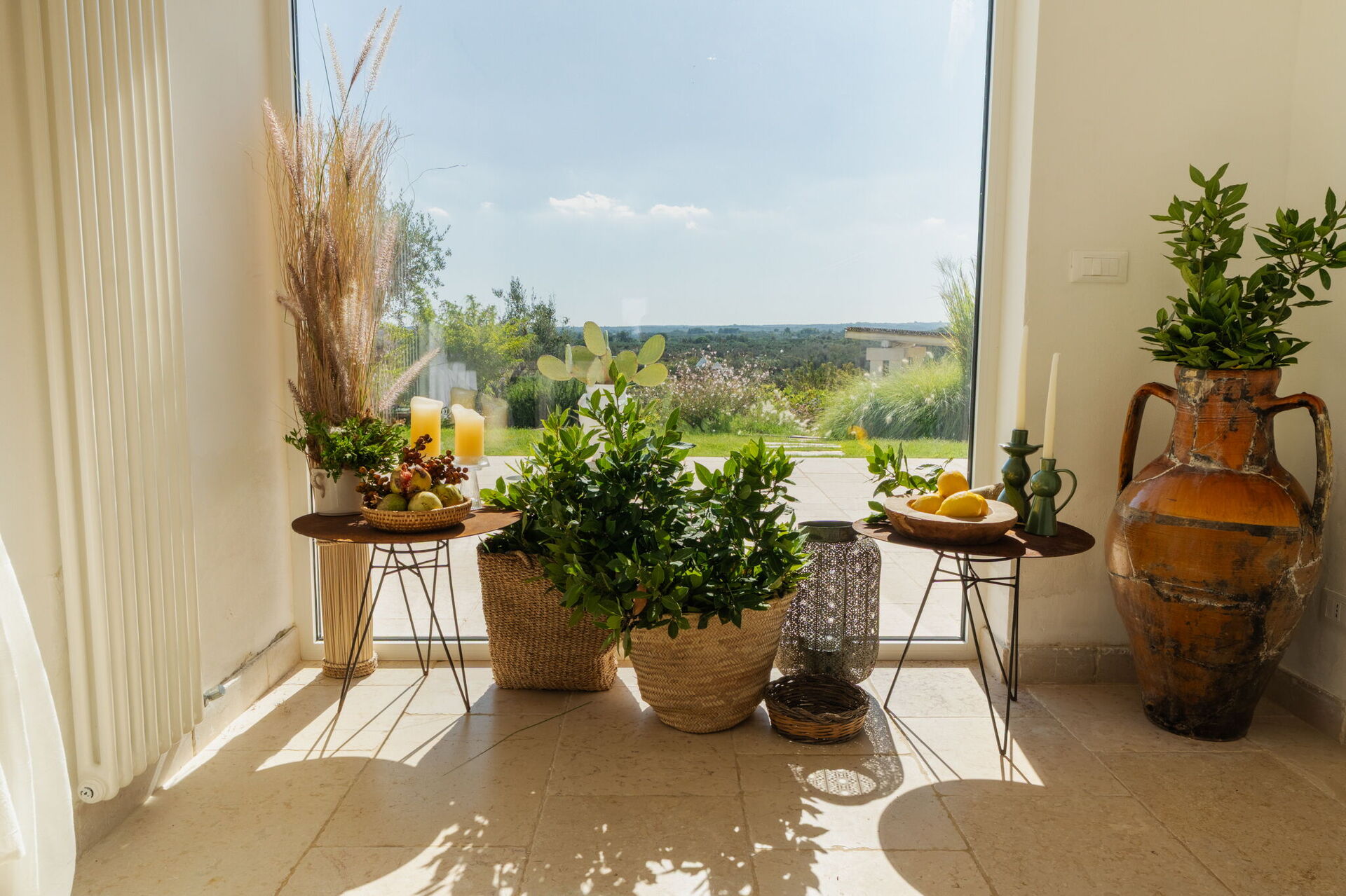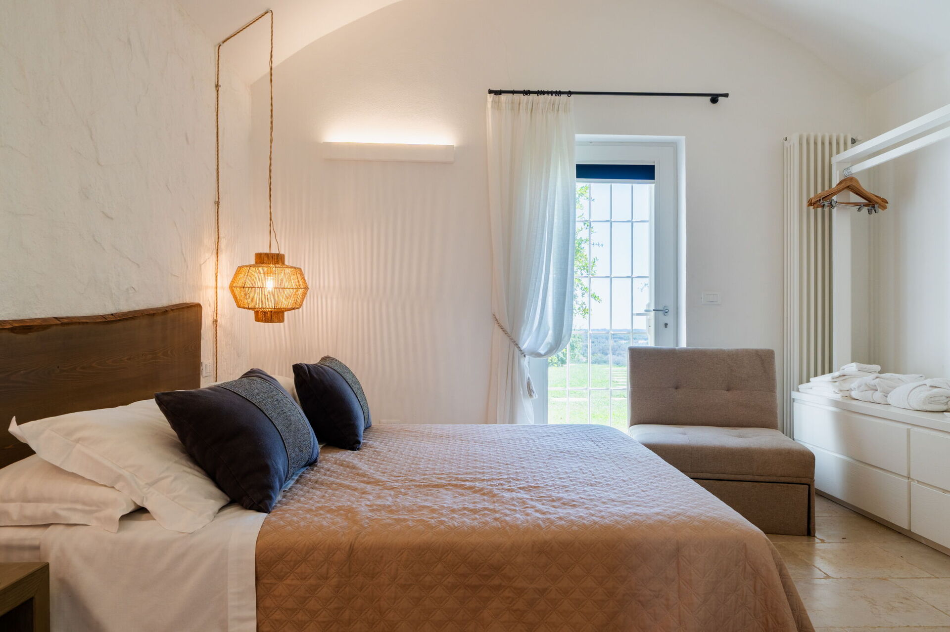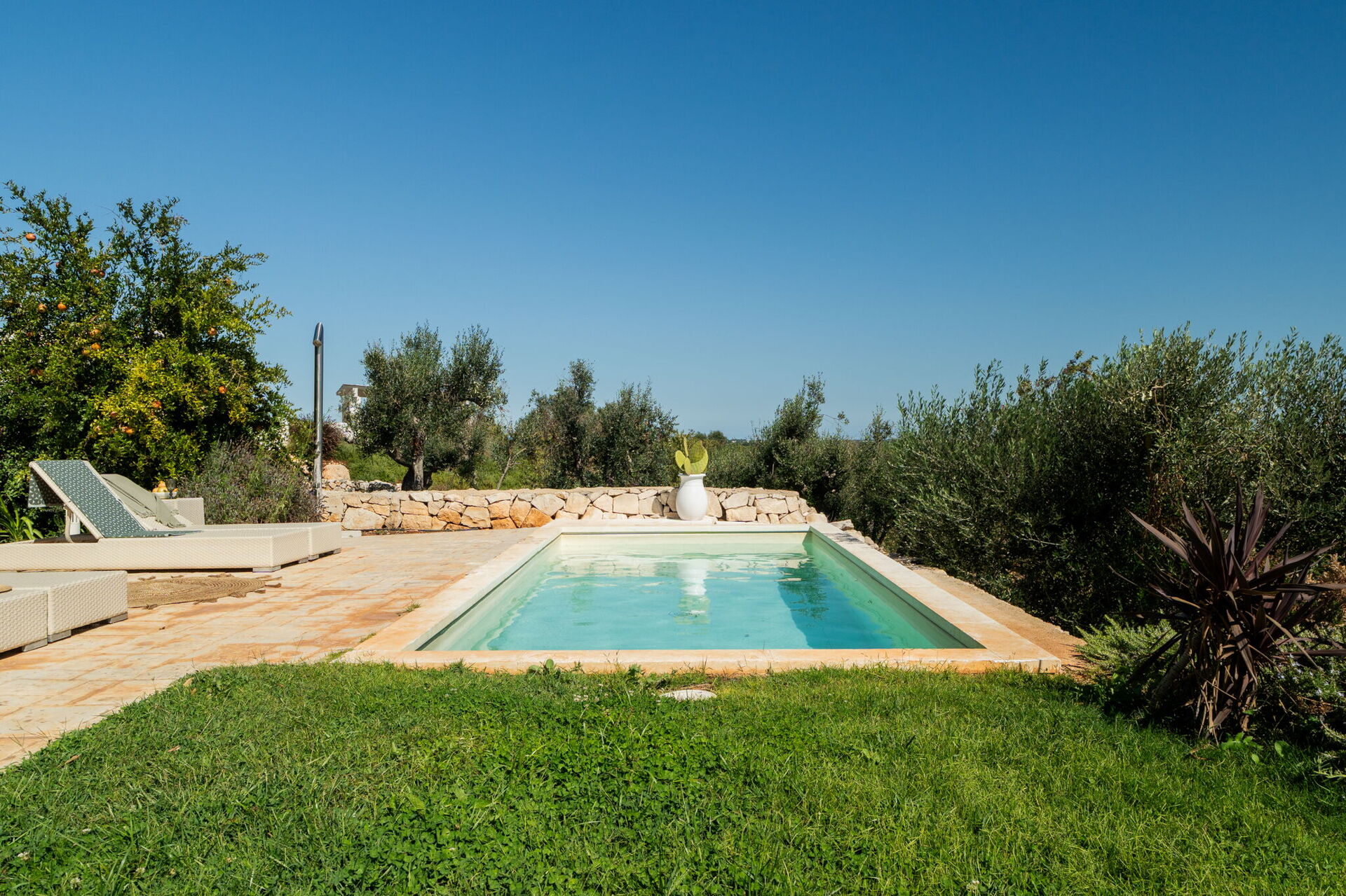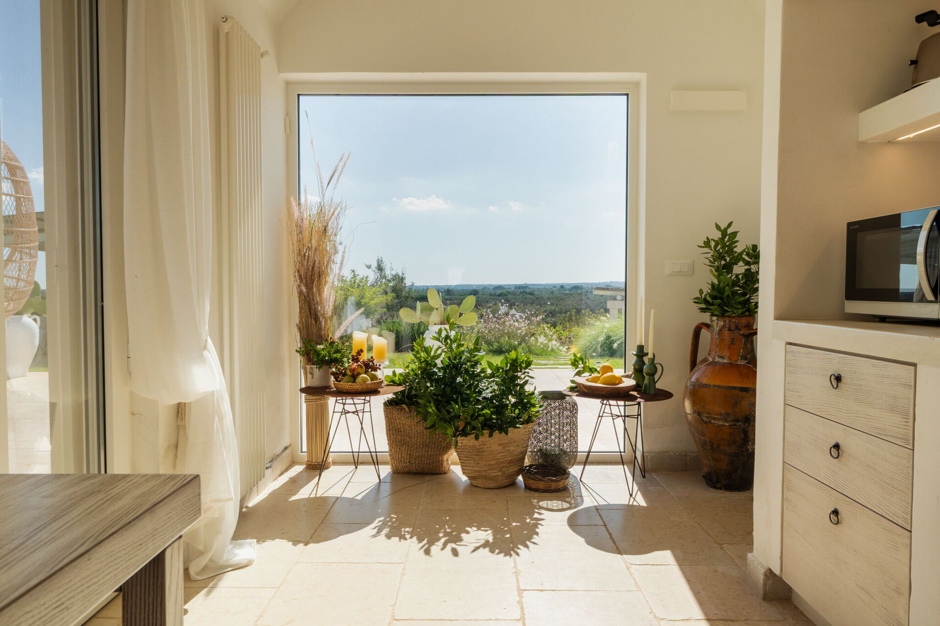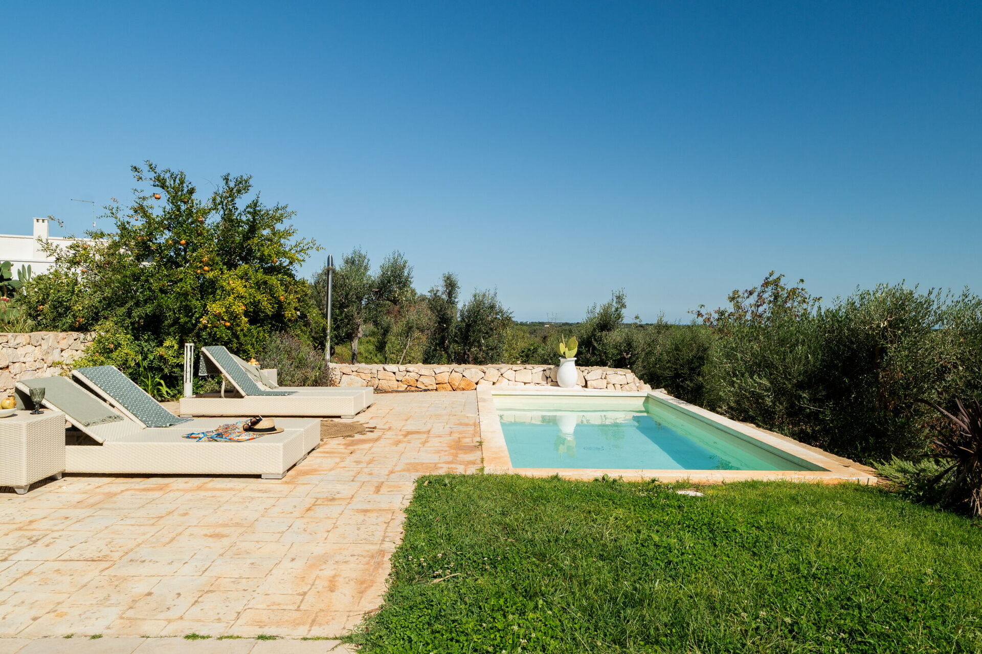Fresh, full of light, this property stands in the countryside, twenty abundant minutes from the coast, this small estate offers privacy and a full immersion in the Apulia countryside, yet it’s close to all the most relevant destinations in the area, just seven kilometres from Ostuni. The home design, approached with research in the historical context, results in a newclassic style with modern tiled floors and tuff stone walls together with vaulted ceilings that lend a rustic and airy feel to the interiors. Elements of classic local residential architecture, such as the exposed stones, are combined with contemporary touches, like bottom to ceiling windows and modern infrastructure and energysaving systems.