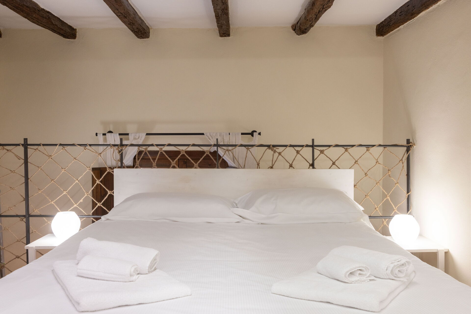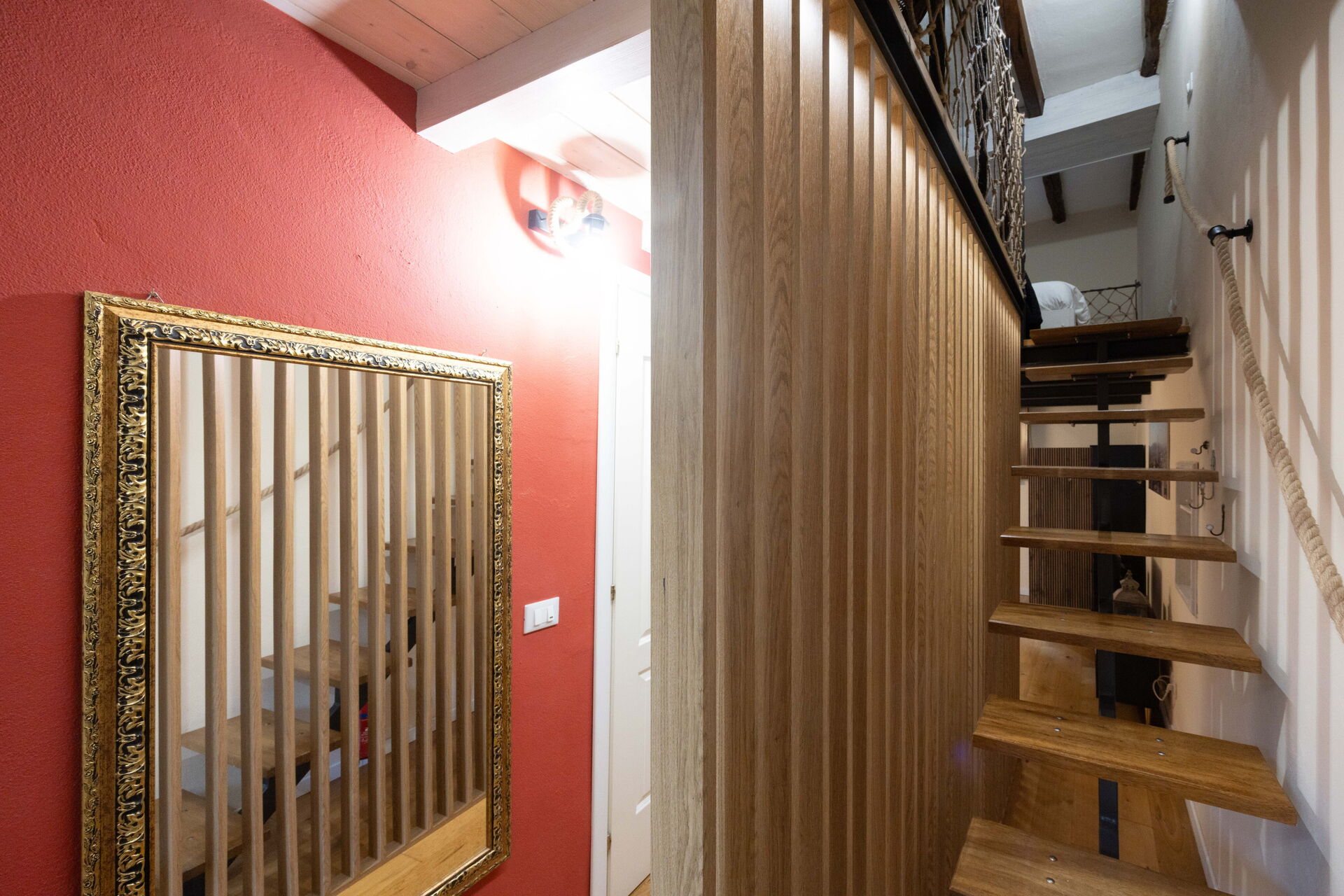 Climbing an iron and wood staircase you reach the mezzanine floor, a real gem: on one side a relaxation area with a sofa and a second TV, on the other the double bedroom with a queen size bed, wardrobe and beams that tell centuries-old stories. The lowered arch of the ceiling creates a cozy atmosphere, almost like a nest: perfect for those looking for a deep, protected, almost fairytale sleep.