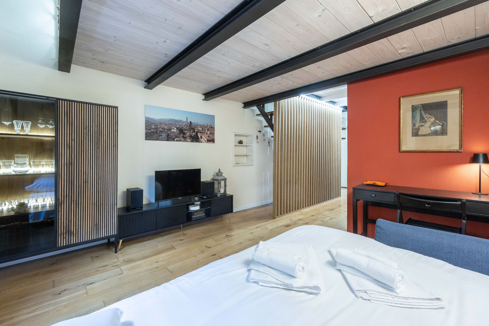 Senzanome Escape is a cozy 50 square meter loft designed for those looking for the perfect combination of contemporary comfort and historic charm. Renovated with love and foresight, it preserves typical Bolognese architectural elements, such as exposed beams and a beautiful red brick arch, but dresses them with a modern, essential and refined style.
