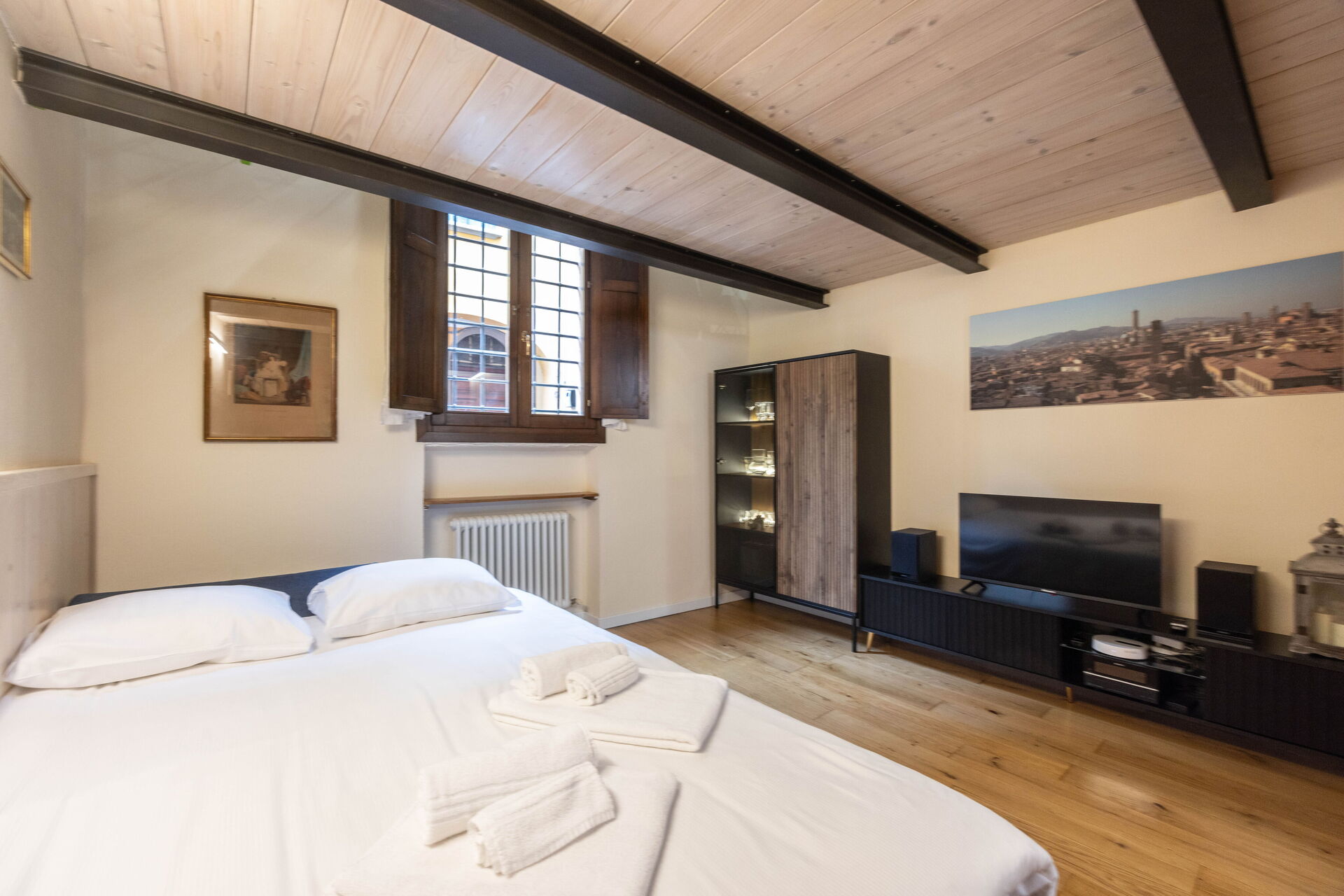 Walking from here towards the heart of the city is a rare pleasure: in a few minutes you reach the majestic Piazza Maggiore, the beating heart of Bologna, with the Basilica of San Petronio, the Fountain of Neptune, the Town Hall, the Palace of King Enzo and the Palazzo d'Accursio. Just around the corner you'll find yourself under the famous Two Towers, Garisenda and Asinelli, the undisputed symbols of the city. If you're feeling fit you can climb the 498 steps of the Asinelli Tower for a breathtaking view over the red roofs of the city.