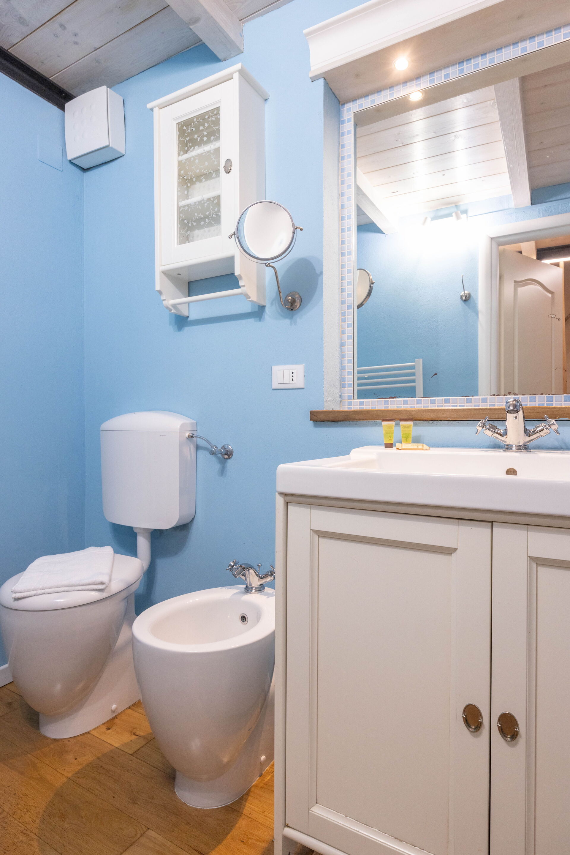 Continuing on, you enter a warm and welcoming living area, where the parquet and wooden details harmonize with a comfortable double sofa bed, a TV, a stereo and, a rare and fascinating detail, an upright piano, available on request for the most inspired guests. Whether it's an impromptu serenade or a solitary exercise, music has its place here.