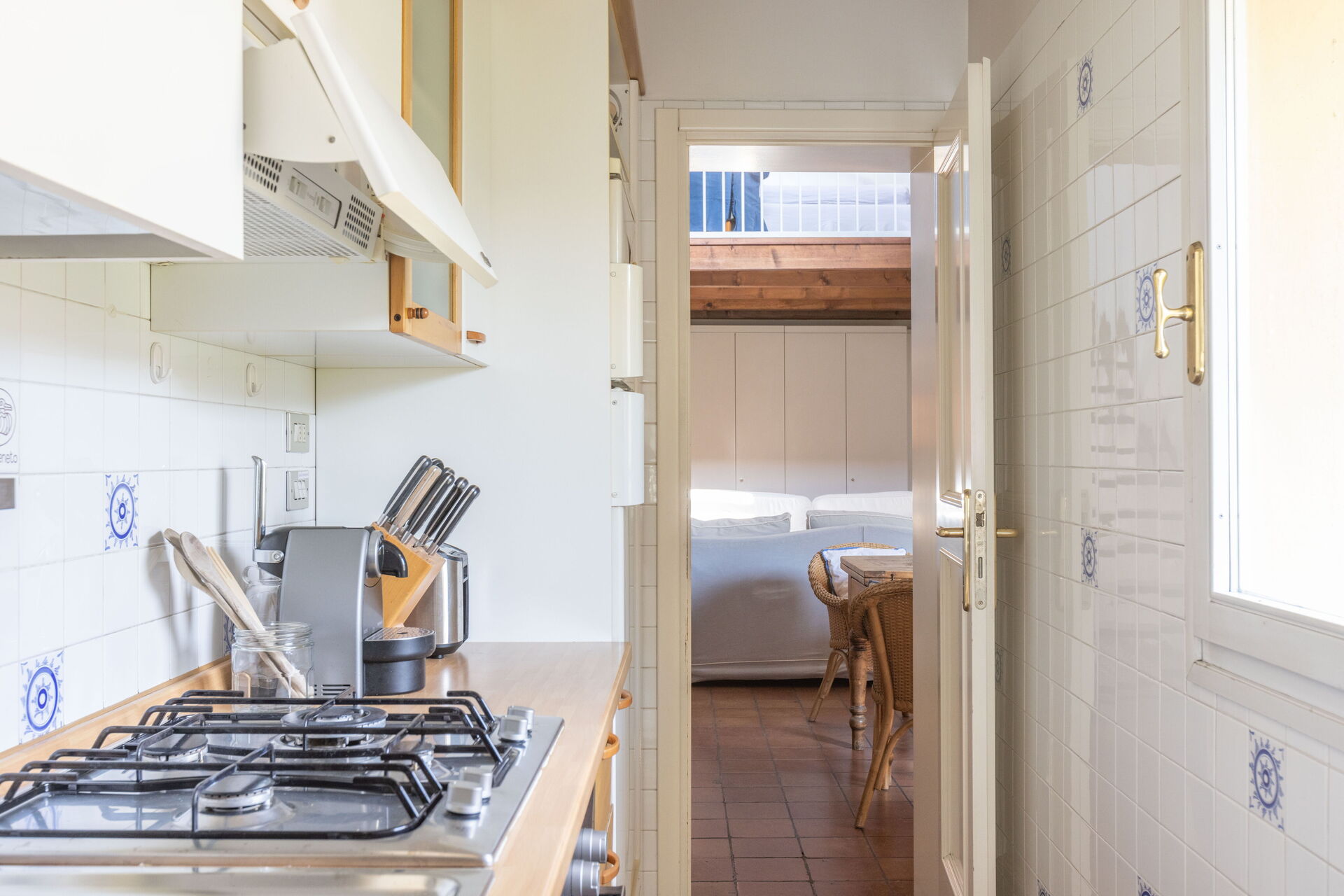 As you enter on the left is living room with a sofa bed can be split into two single beds, at the first level the bedroom with double bed (mattress 160 cm - can be divided) and ensuite bathroom with shower curtain. In the living room on the right a dinig table with 4/6 seater dining table. Follows a living room with couch and a flat screen Tv. On the right full equipped kitchen.