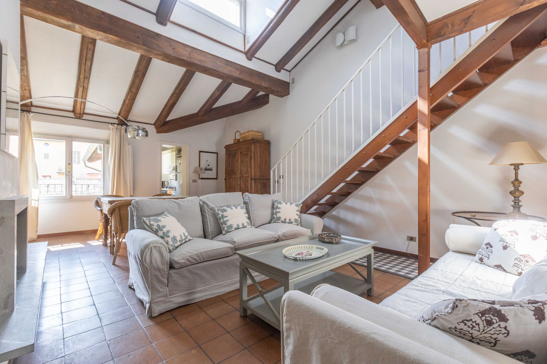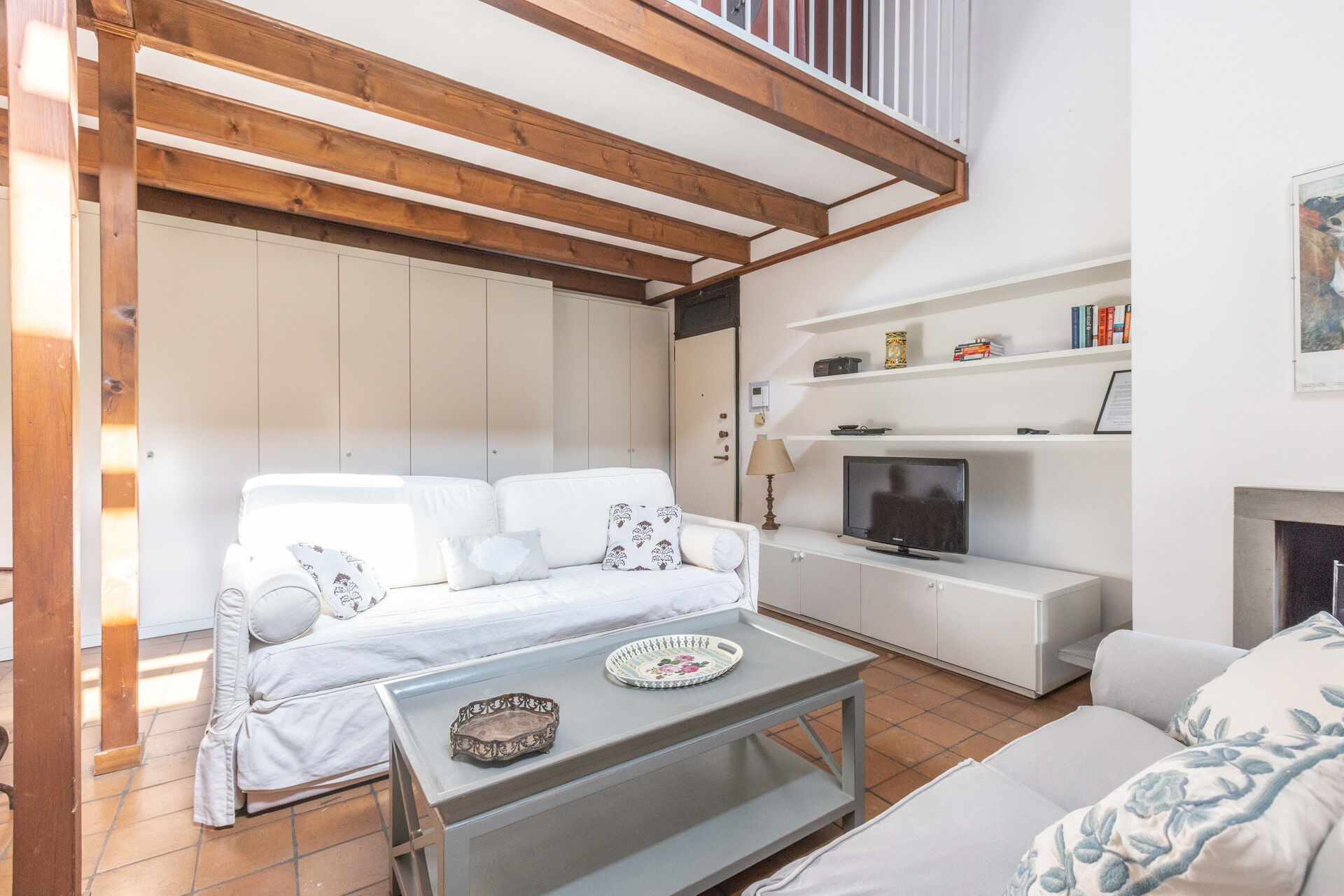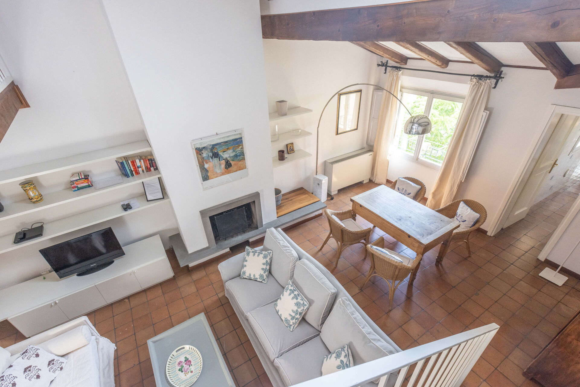The living room has direct access to a spacious terrace furnished with outdoor table and chairs which offers a stunning view over the Square.