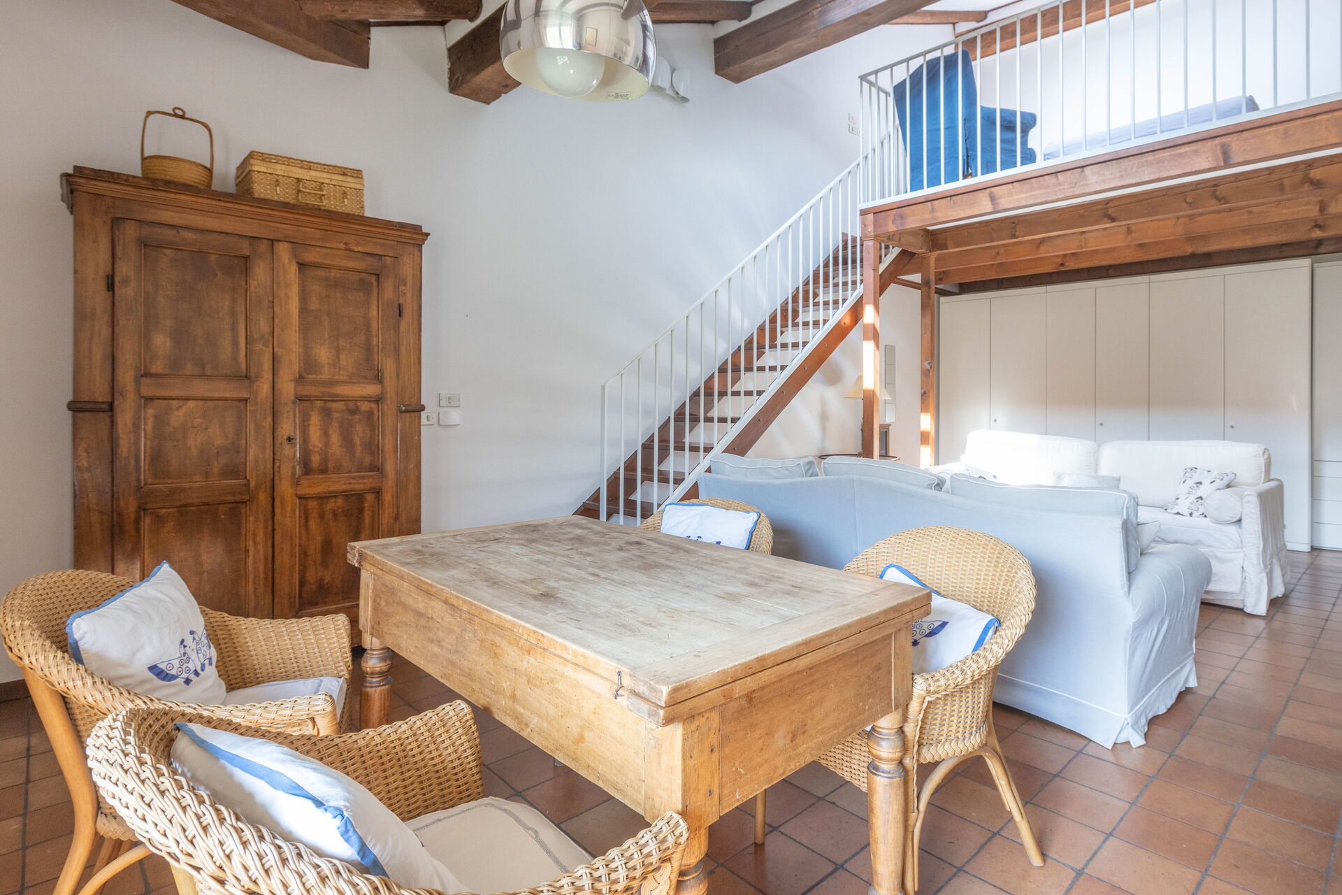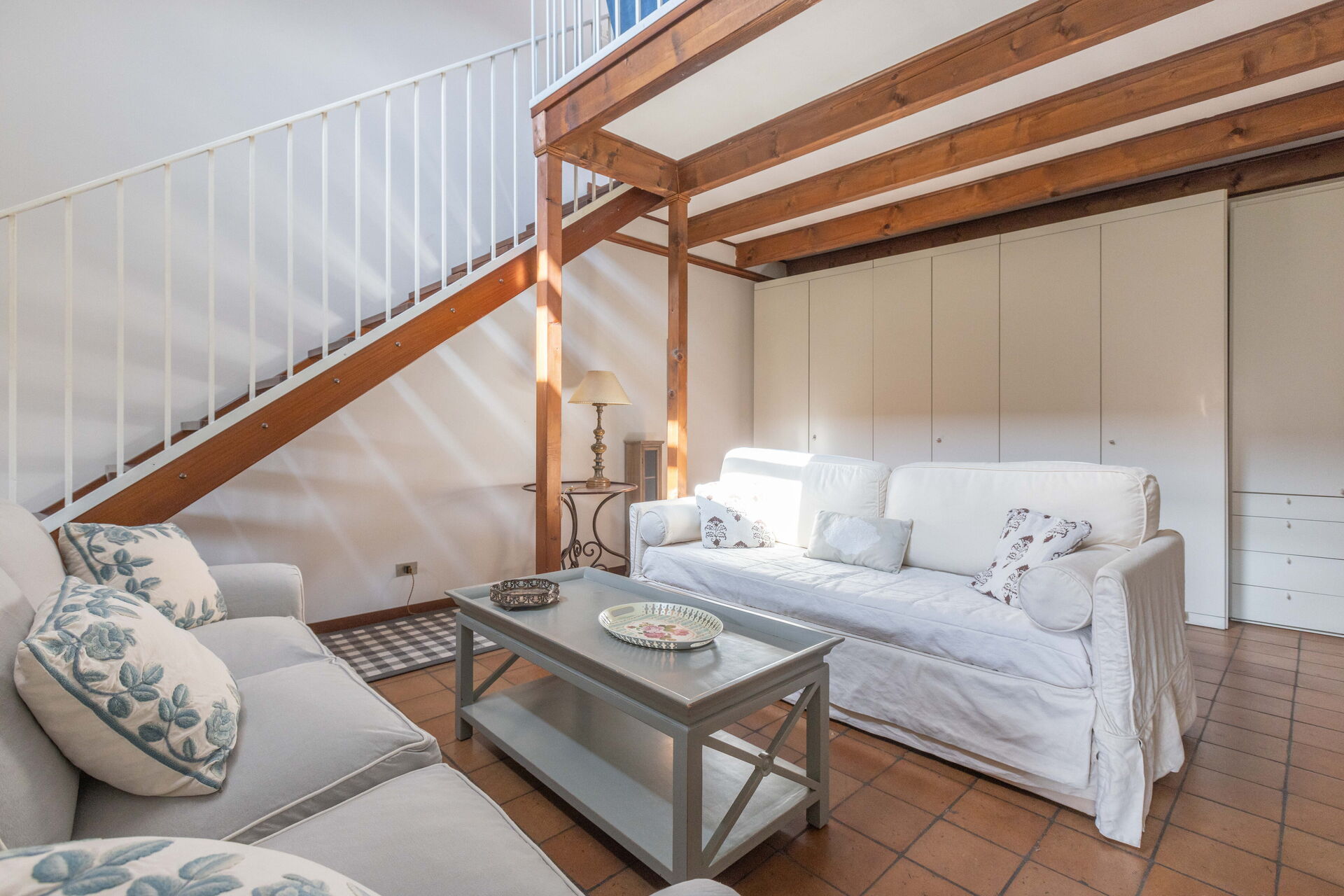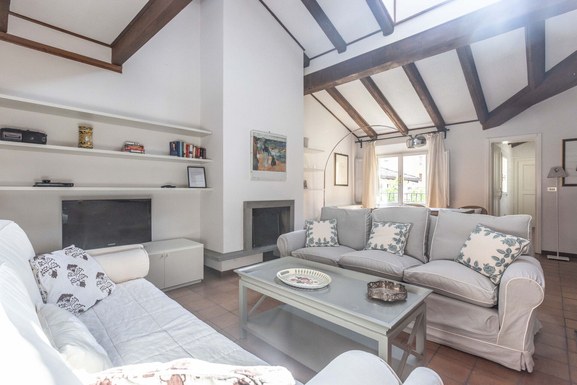 The living room has direct access to a spacious terrace furnished with outdoor table and chairs which offers a stunning view over the Square.