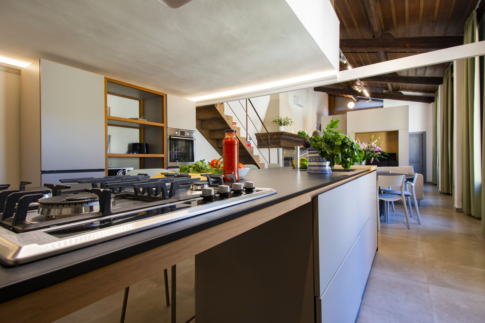 The fully equipped kitchen features high-quality appliances, ample workspace, and everything needed to prepare anything from a relaxed breakfast to a full Tuscan dinner at home.