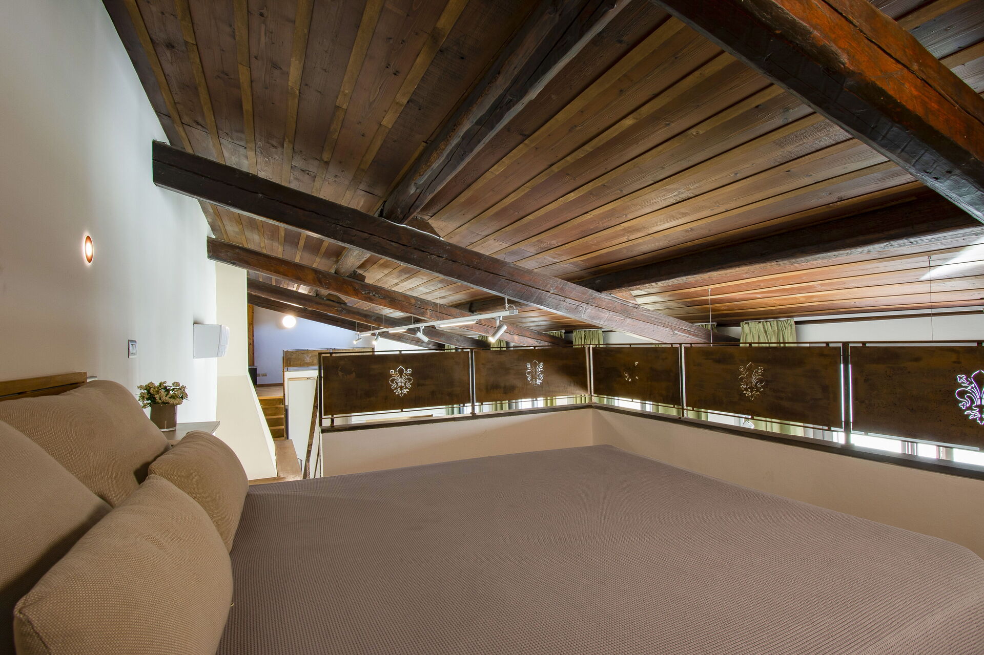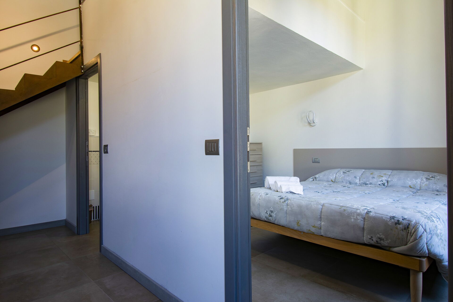 A beautiful master bedroom with a king-size bed (160 cm, separable upon request), access to a private terrace overlooking the inner courtyard, and a private bathroom with a walk-in shower.