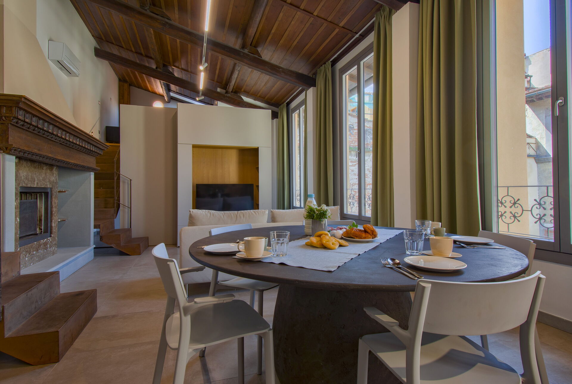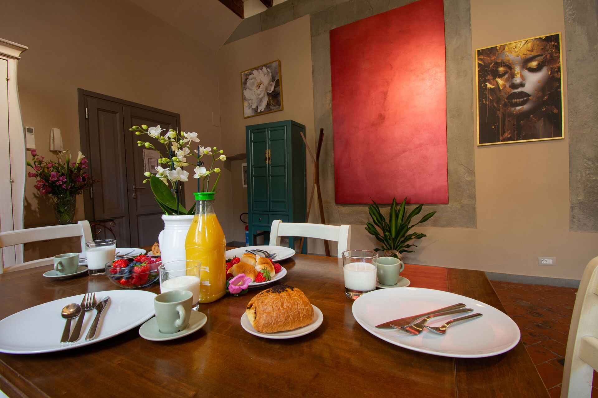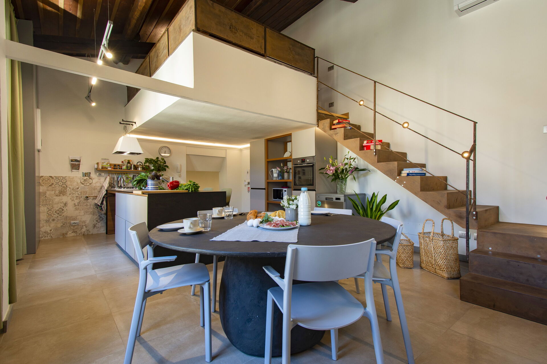 To the left, a spacious dining room with a 12-seater table provides a warm setting for shared meals. This room flows into a fully equipped modern kitchen, featuring high-end appliances and ample workspace for preparing everything from morning coffee to Tuscan feasts.