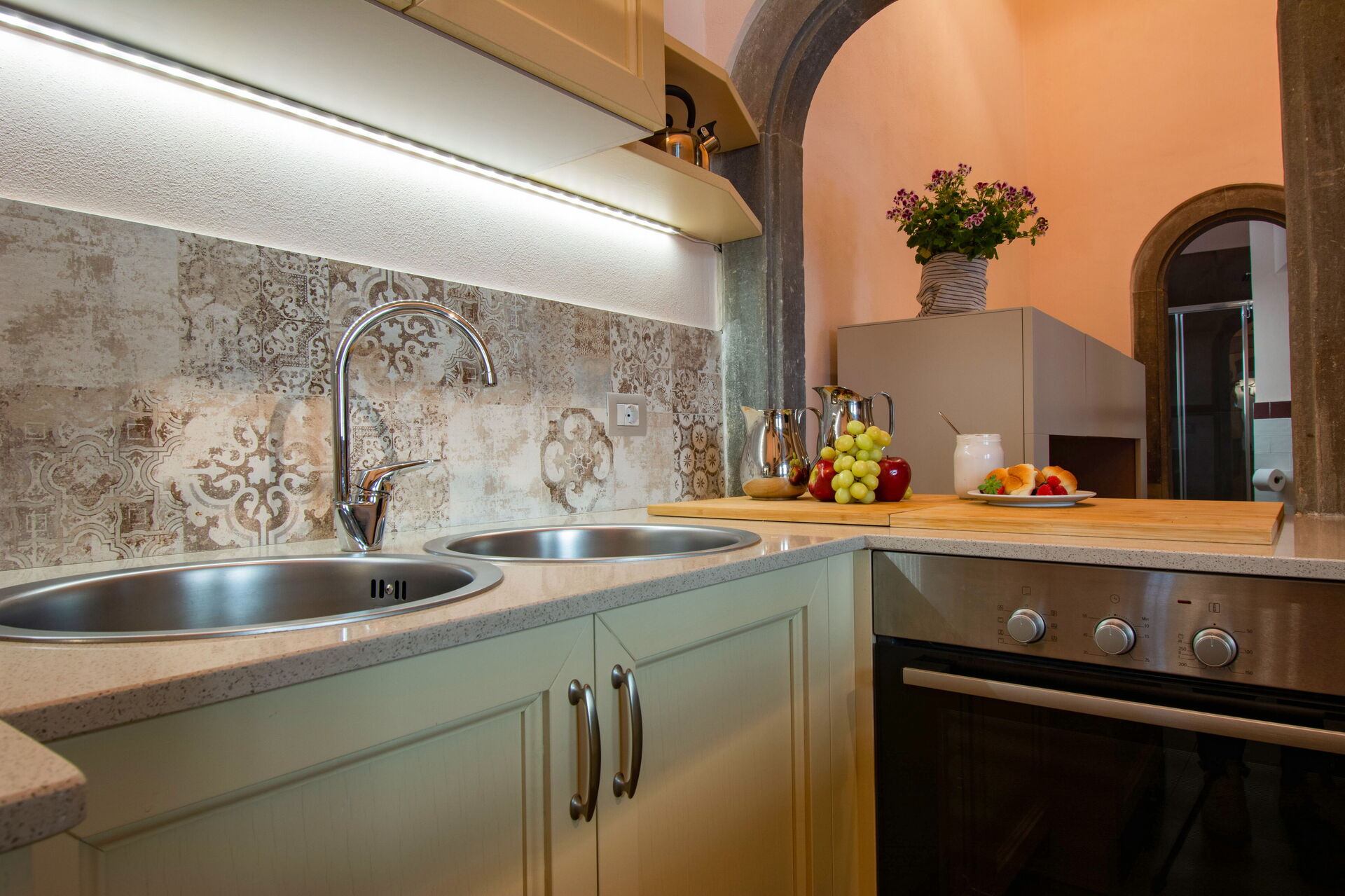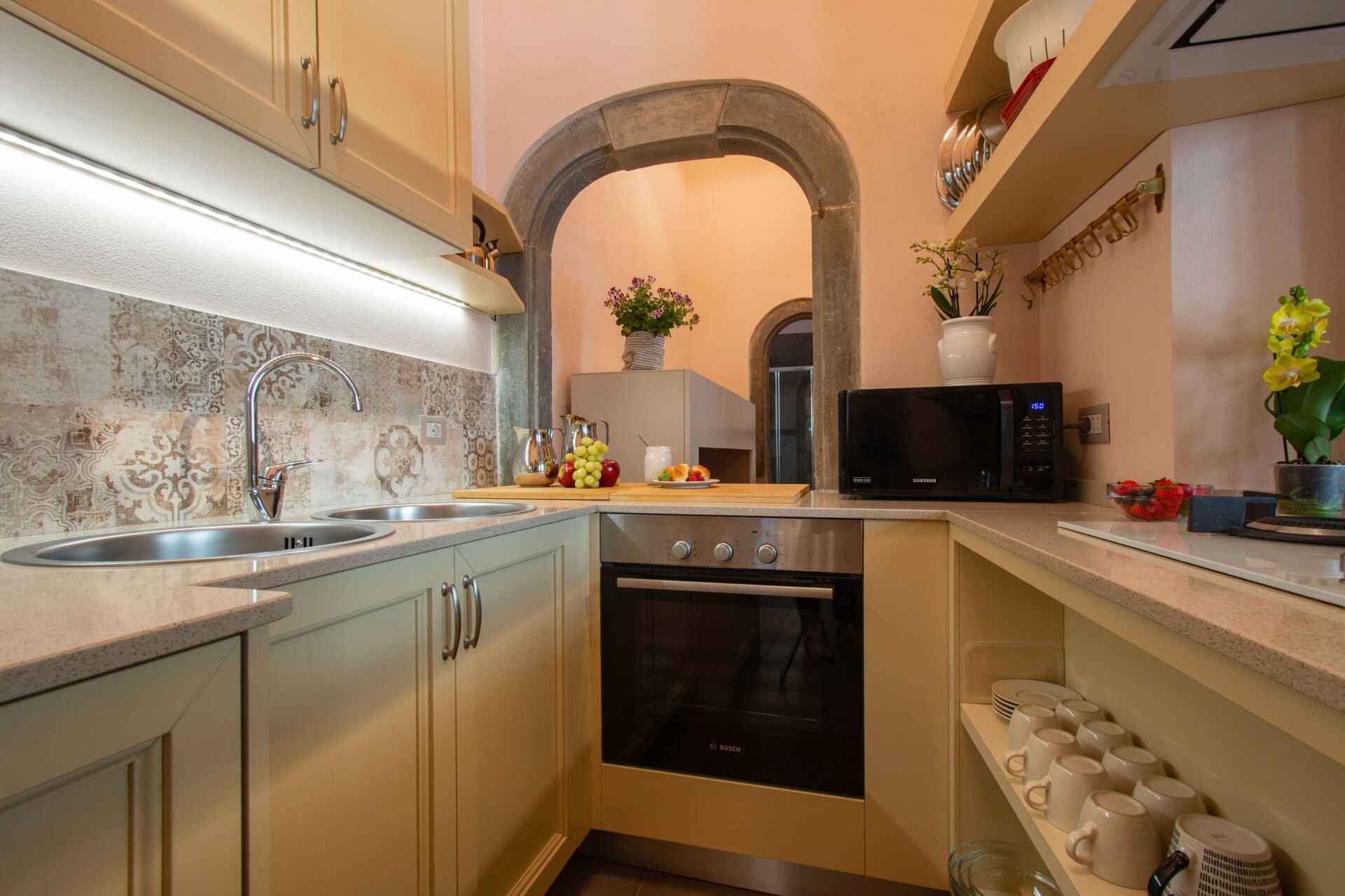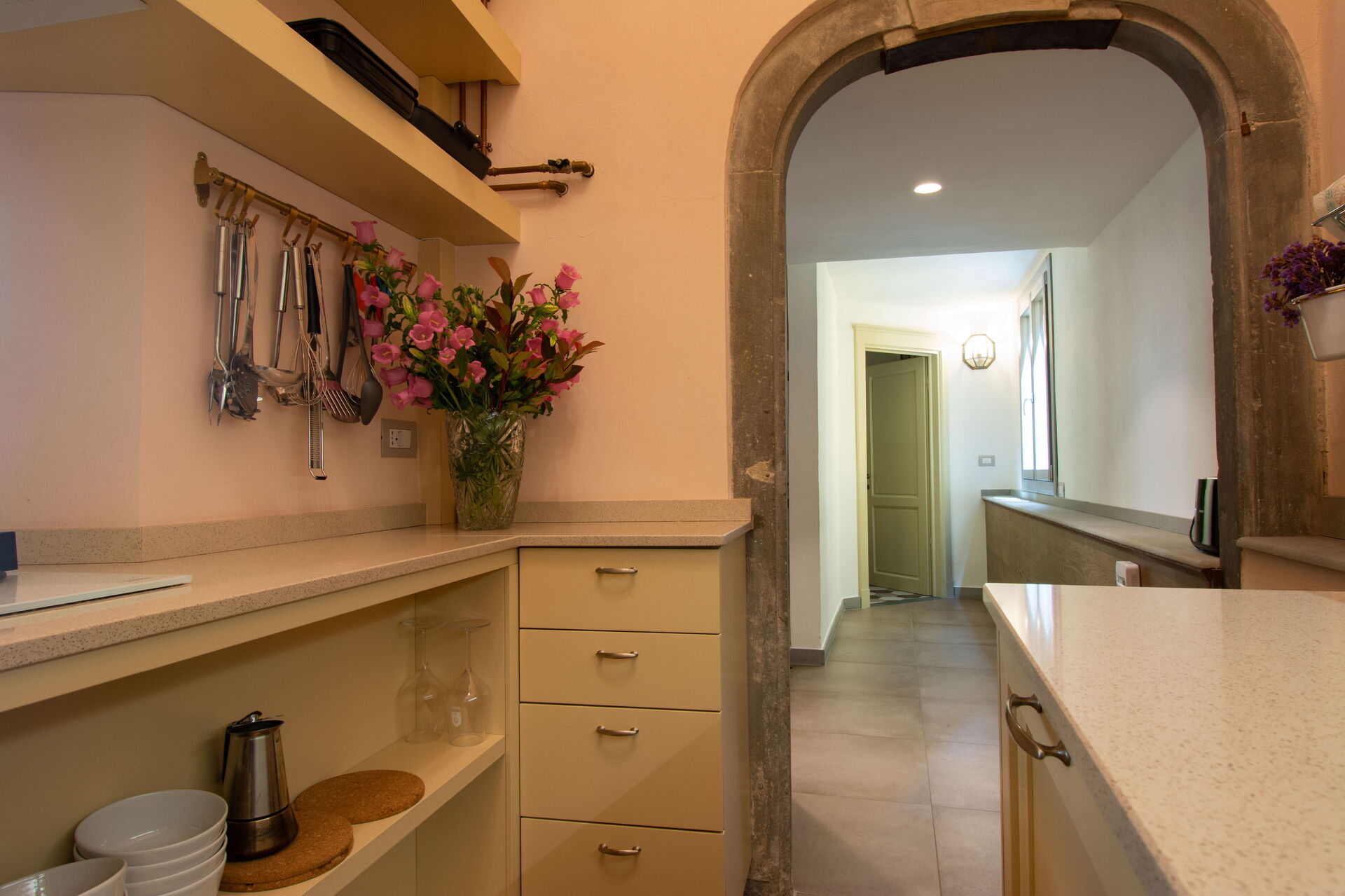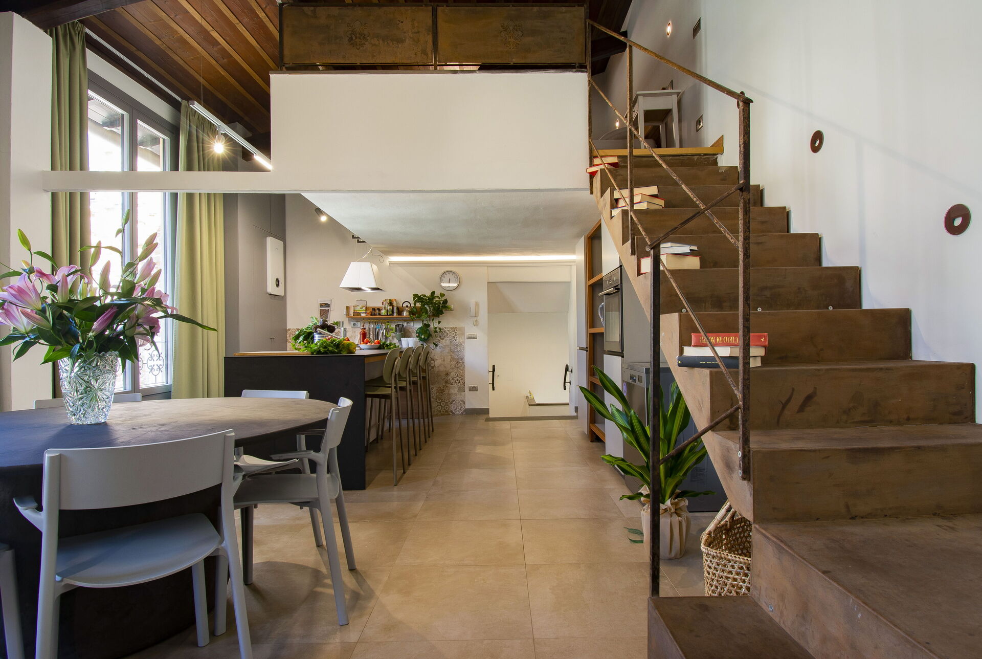 To the left, a spacious dining room with a 12-seater table provides a warm setting for shared meals. This room flows into a fully equipped modern kitchen, featuring high-end appliances and ample workspace for preparing everything from morning coffee to Tuscan feasts.