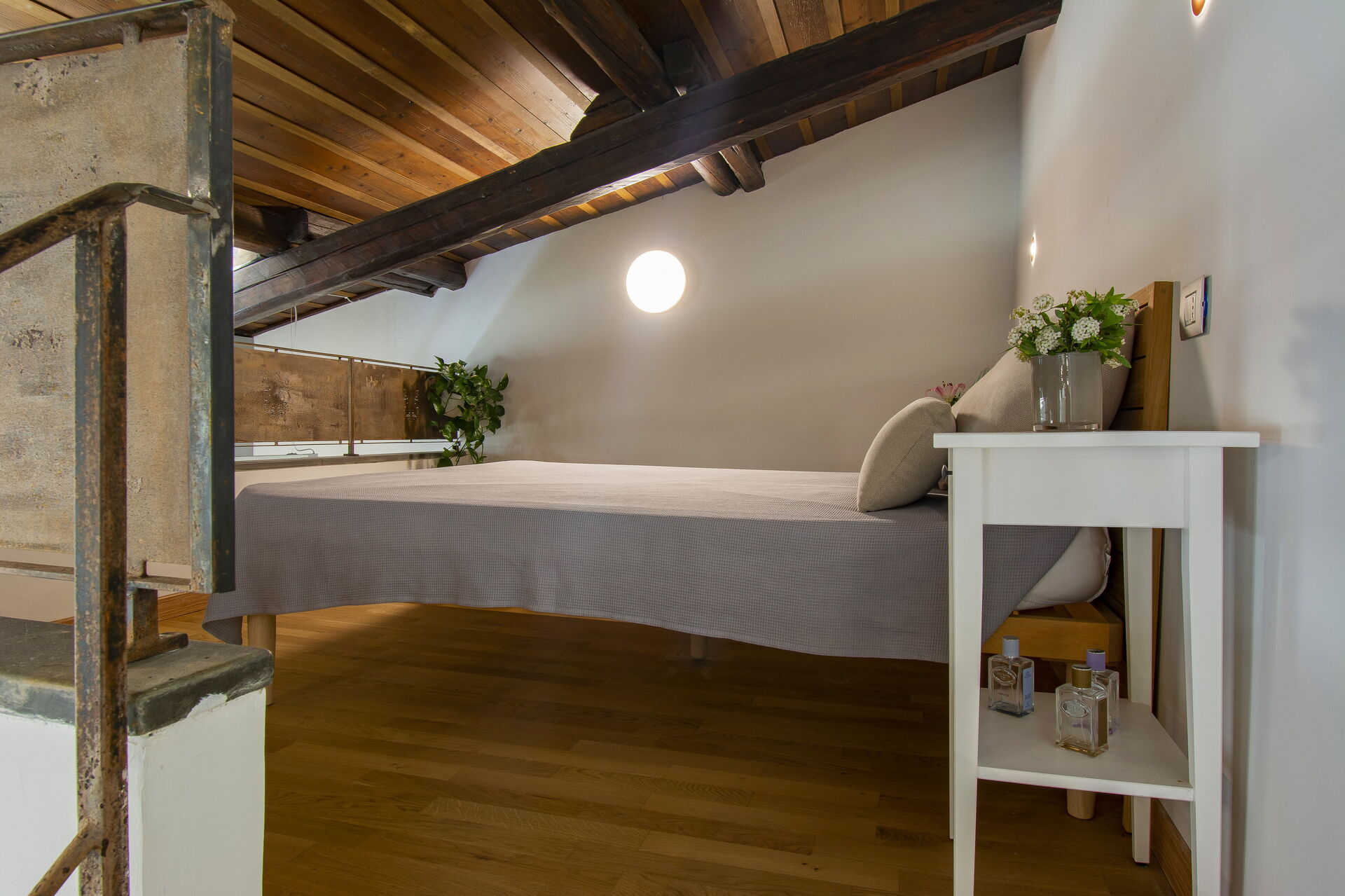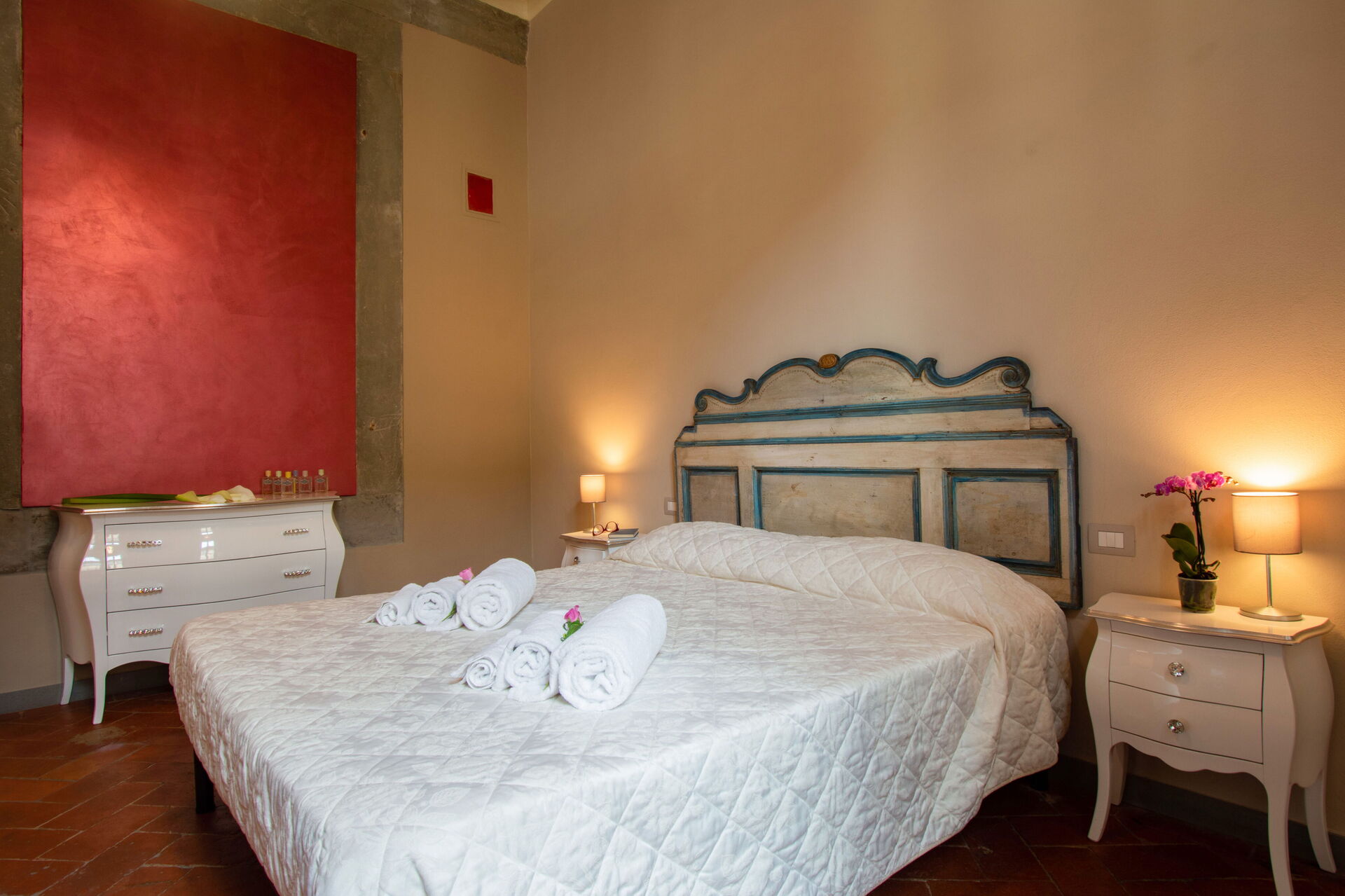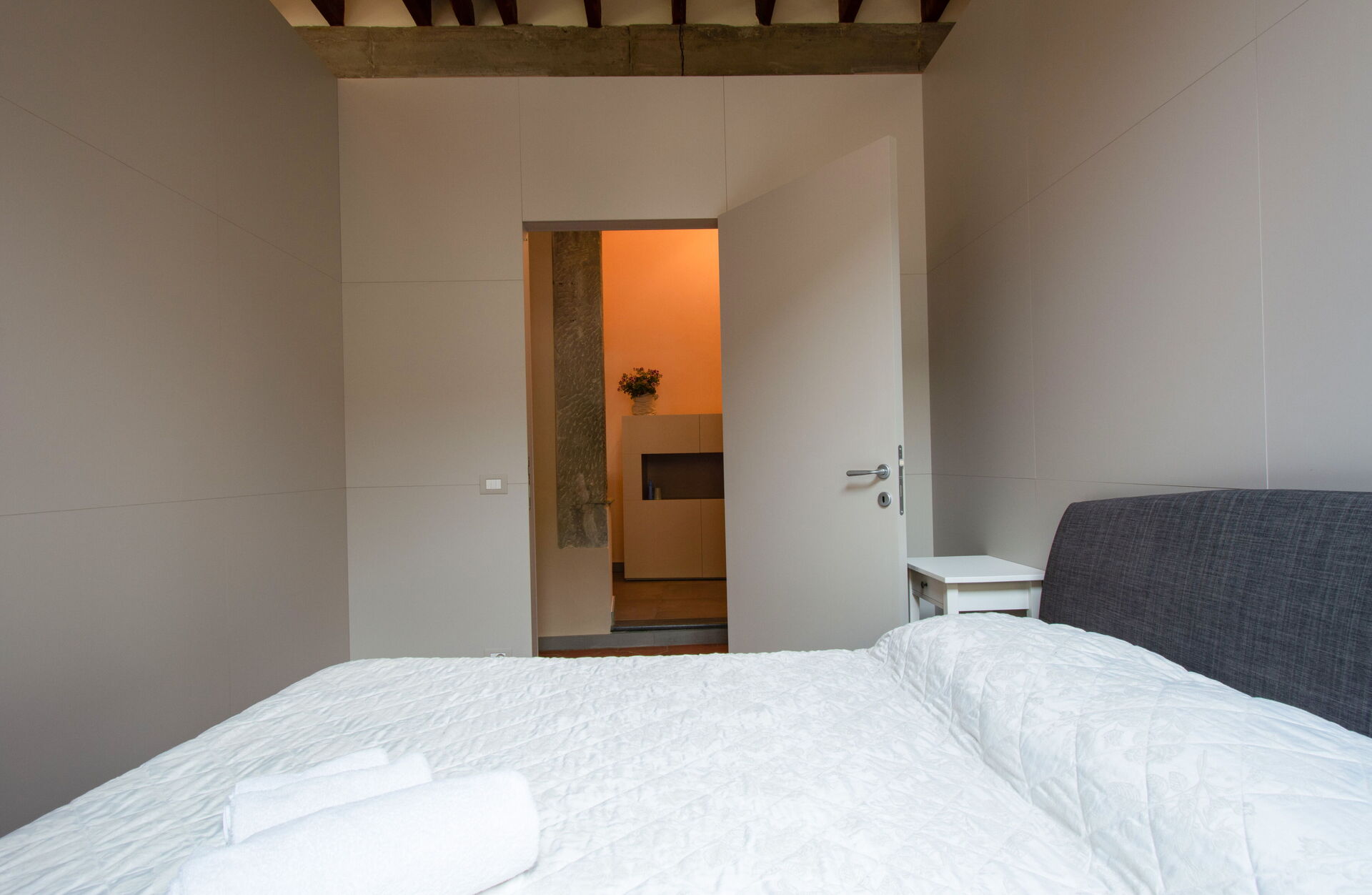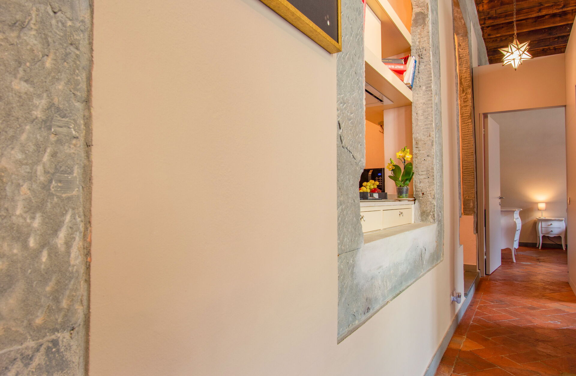 A central hallway connects the living and dining areas to the sleeping quarters. Each of the five bedrooms offers maximum comfort, flexible bed arrangements, and private access to a bathroom. The first bedroom (with a divisible 160 cm bed) overlooks Florence’s rooftops and has a bathroom with a bathtub directly opposite. The second bedroom (also with a divisible 160 cm bed) includes access to a private terrace and en-suite bathroom with a walk-in shower.