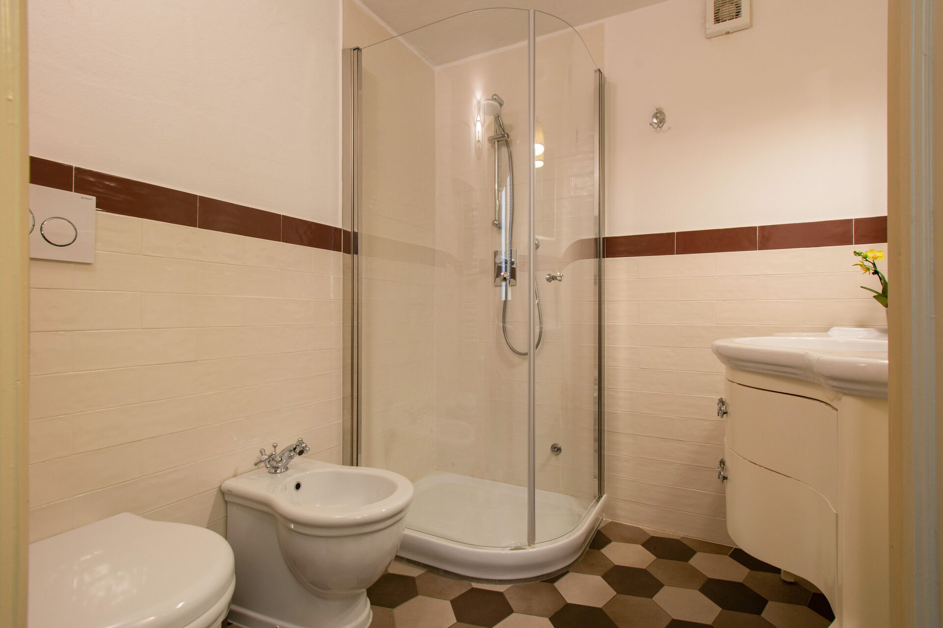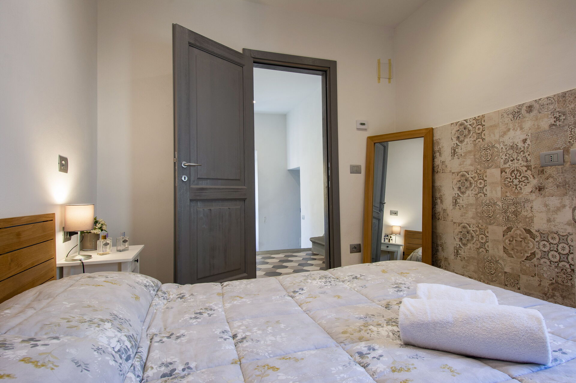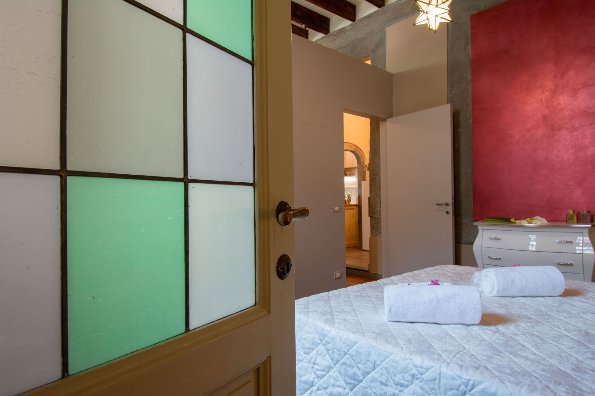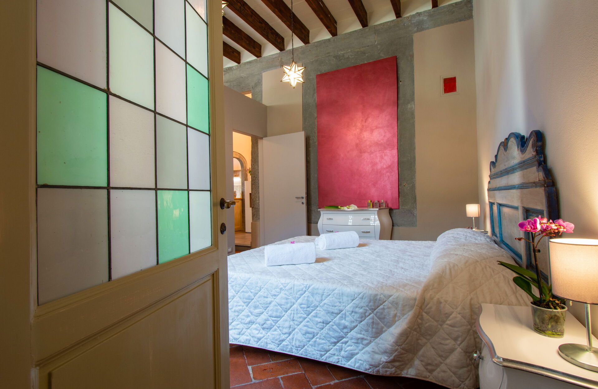 A central hallway connects the living and dining areas to the sleeping quarters. Each of the five bedrooms offers maximum comfort, flexible bed arrangements, and private access to a bathroom. The first bedroom (with a divisible 160 cm bed) overlooks Florence’s rooftops and has a bathroom with a bathtub directly opposite. The second bedroom (also with a divisible 160 cm bed) includes access to a private terrace and en-suite bathroom with a walk-in shower.