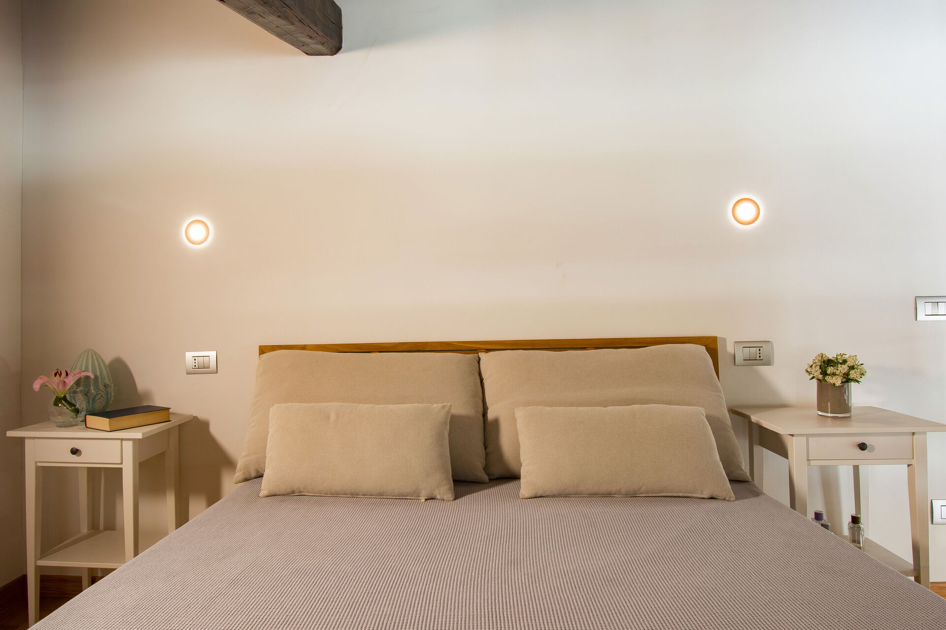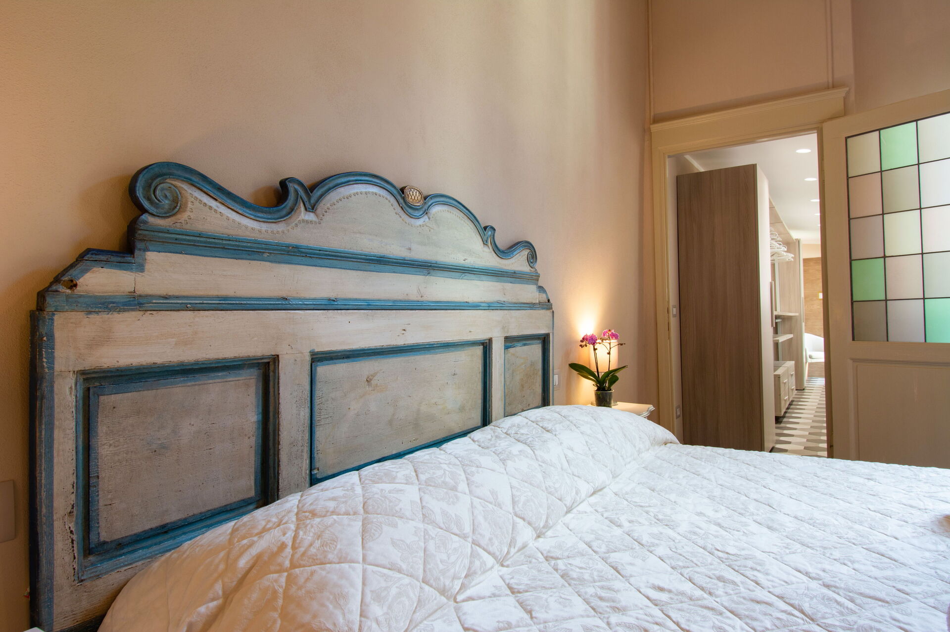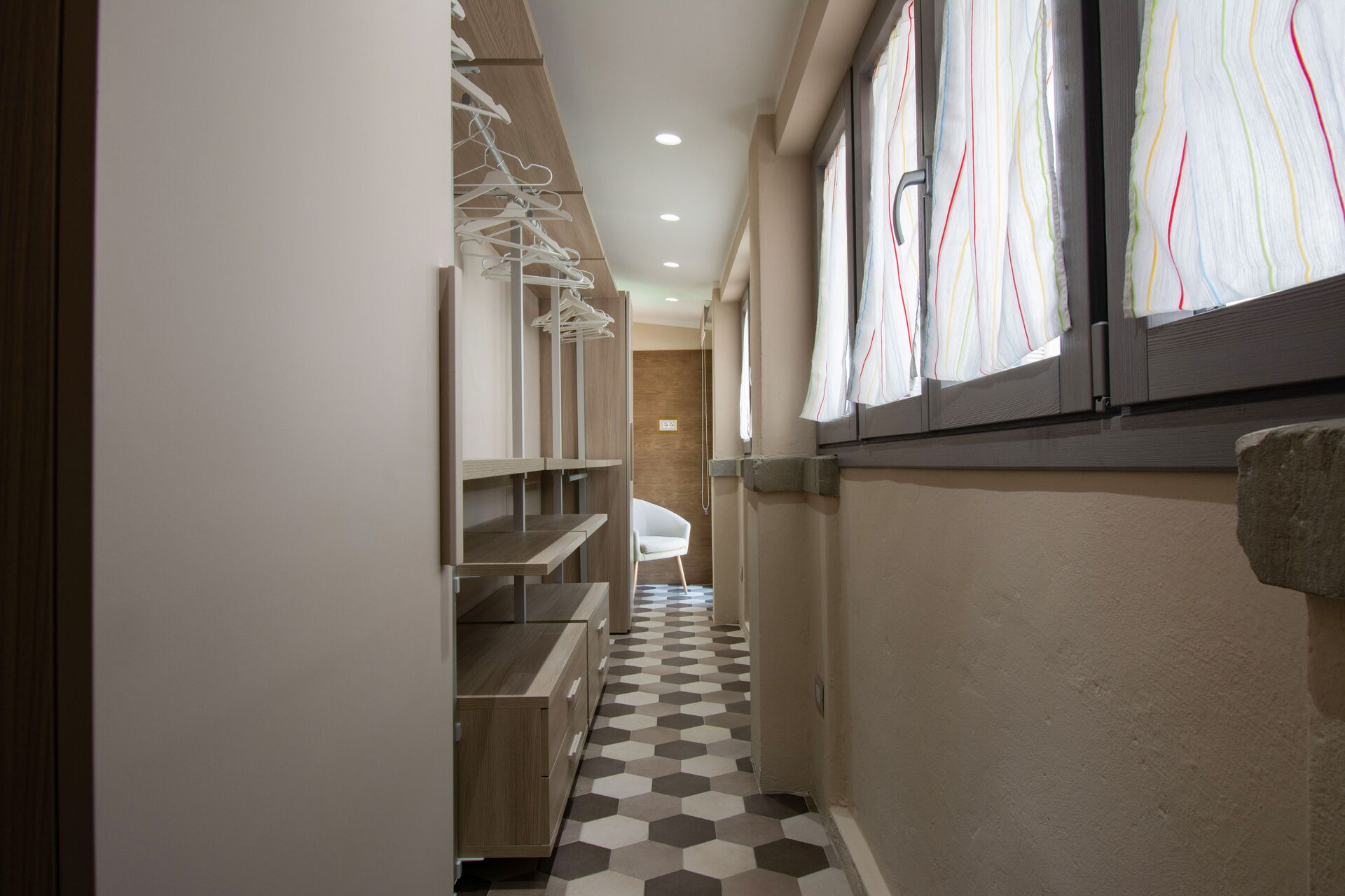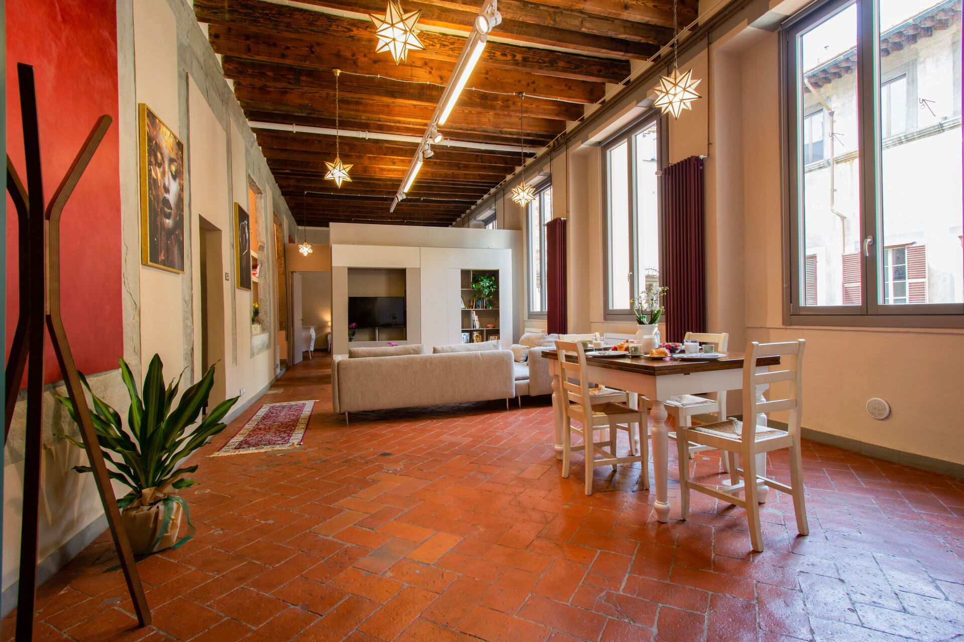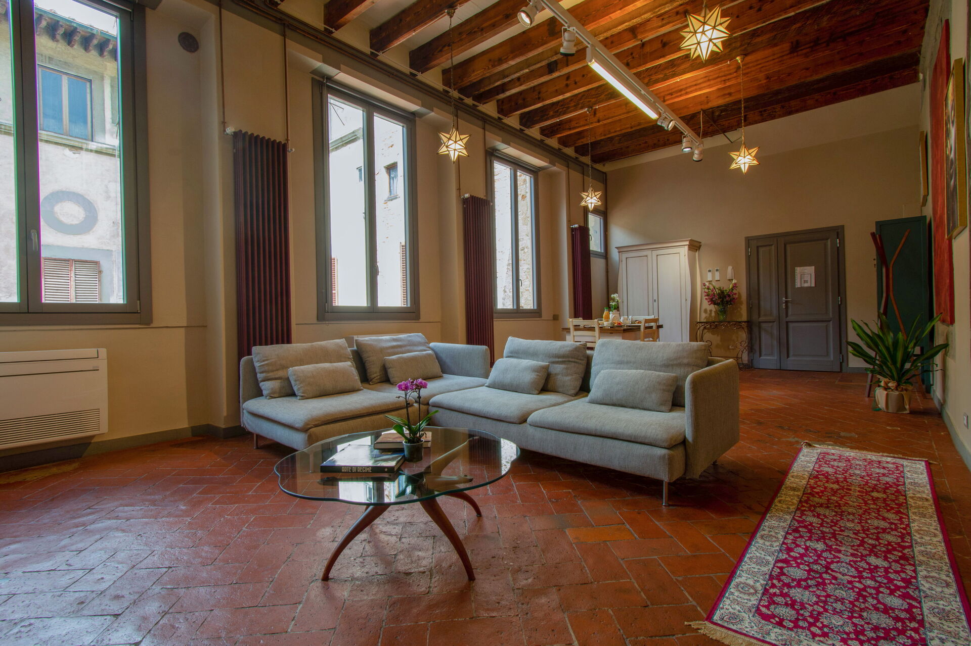 A central hallway connects the living and dining areas to the sleeping quarters. Each of the five bedrooms offers maximum comfort, flexible bed arrangements, and private access to a bathroom. The first bedroom (with a divisible 160 cm bed) overlooks Florence’s rooftops and has a bathroom with a bathtub directly opposite. The second bedroom (also with a divisible 160 cm bed) includes access to a private terrace and en-suite bathroom with a walk-in shower.