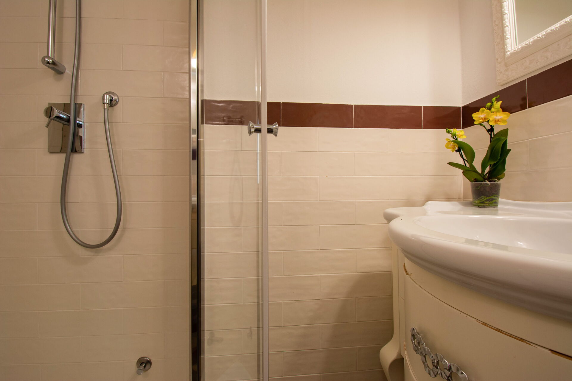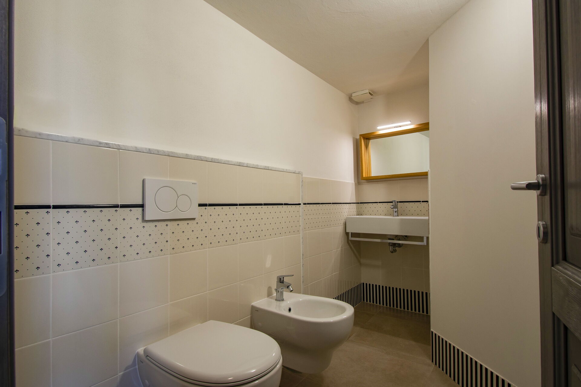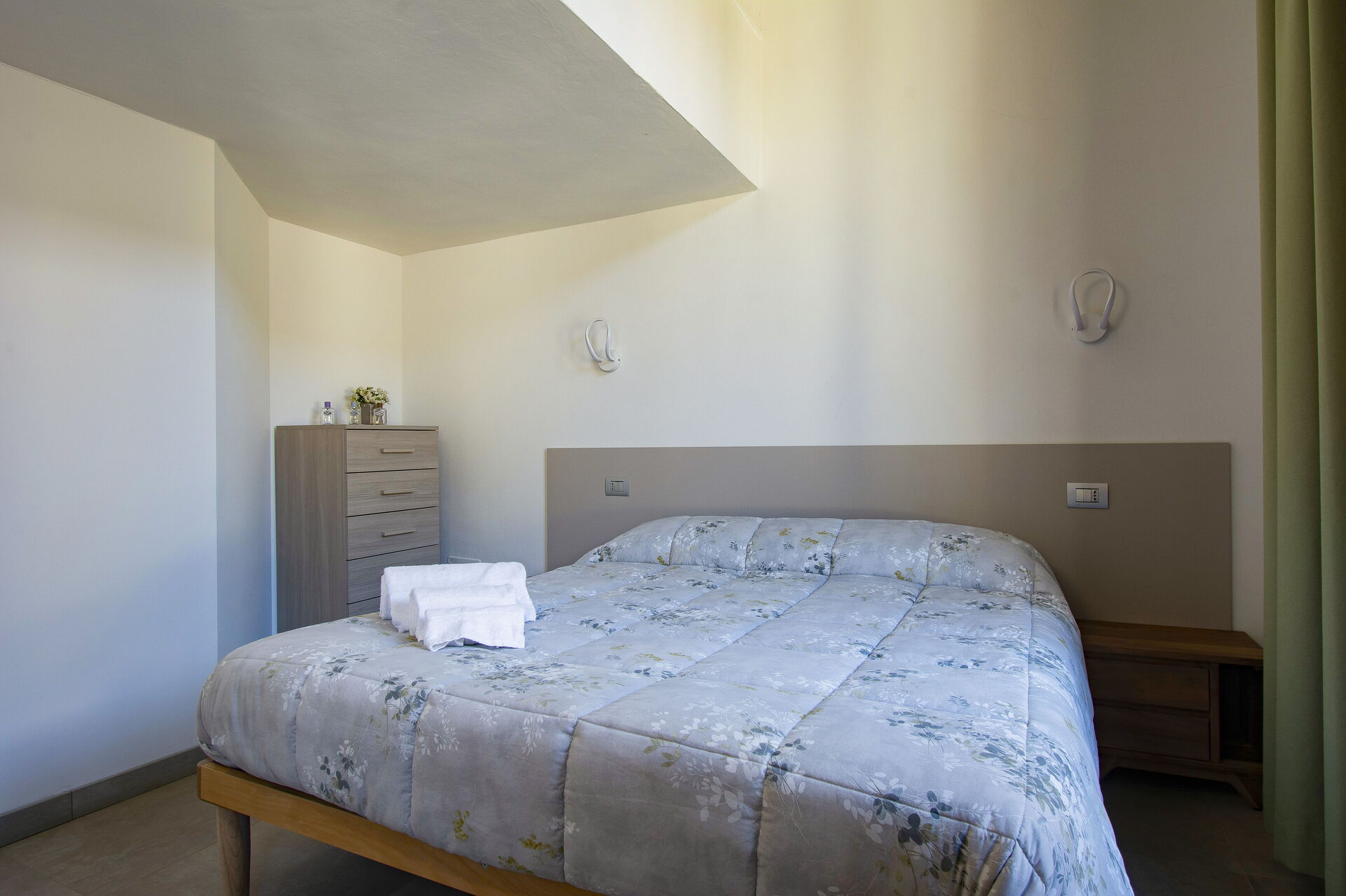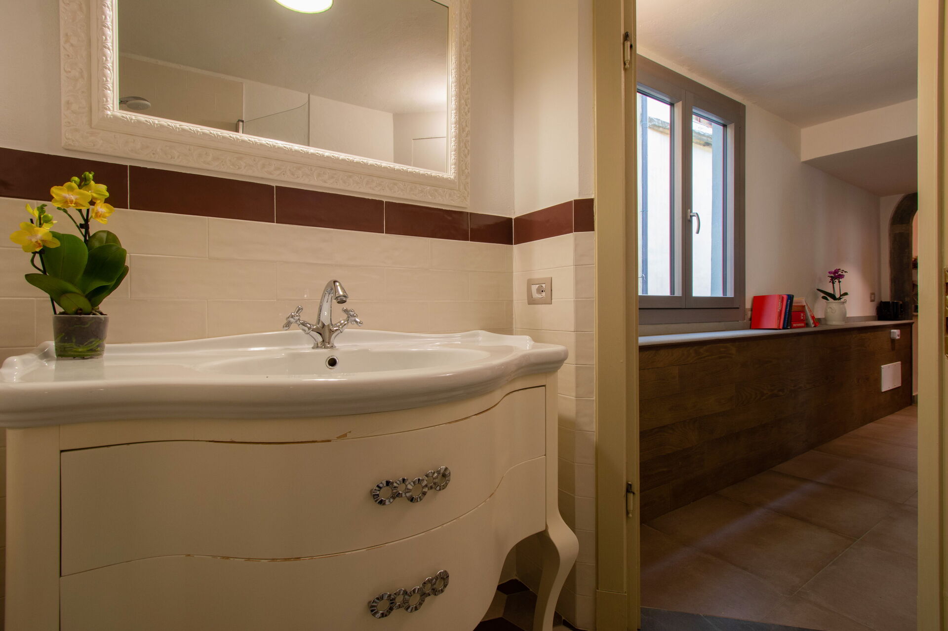 A central hallway connects the living and dining areas to the sleeping quarters. Each of the five bedrooms offers maximum comfort, flexible bed arrangements, and private access to a bathroom. The first bedroom (with a divisible 160 cm bed) overlooks Florence’s rooftops and has a bathroom with a bathtub directly opposite. The second bedroom (also with a divisible 160 cm bed) includes access to a private terrace and en-suite bathroom with a walk-in shower.