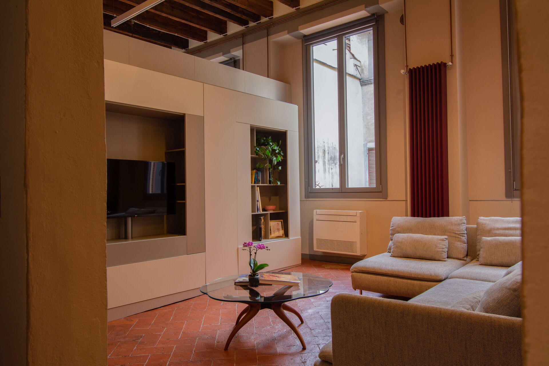 Upon entering the apartment, guests are welcomed into a bright and inviting living area furnished with plush sofas and a large flat-screen television—ideal for relaxing after a day exploring Florence.