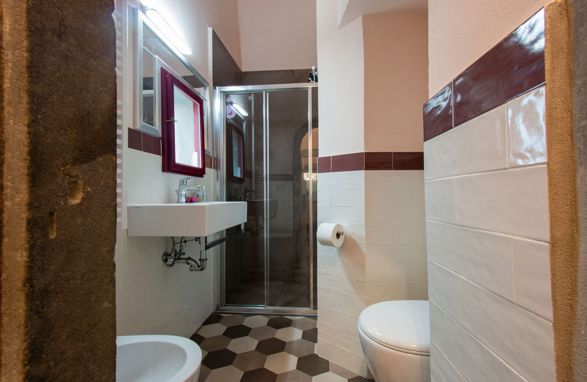 Descending a few steps leads to the three remaining bedrooms—two twins (90 cm beds, not joinable) and one double (160 cm bed)—each with its own en-suite bathroom and walk-in shower.